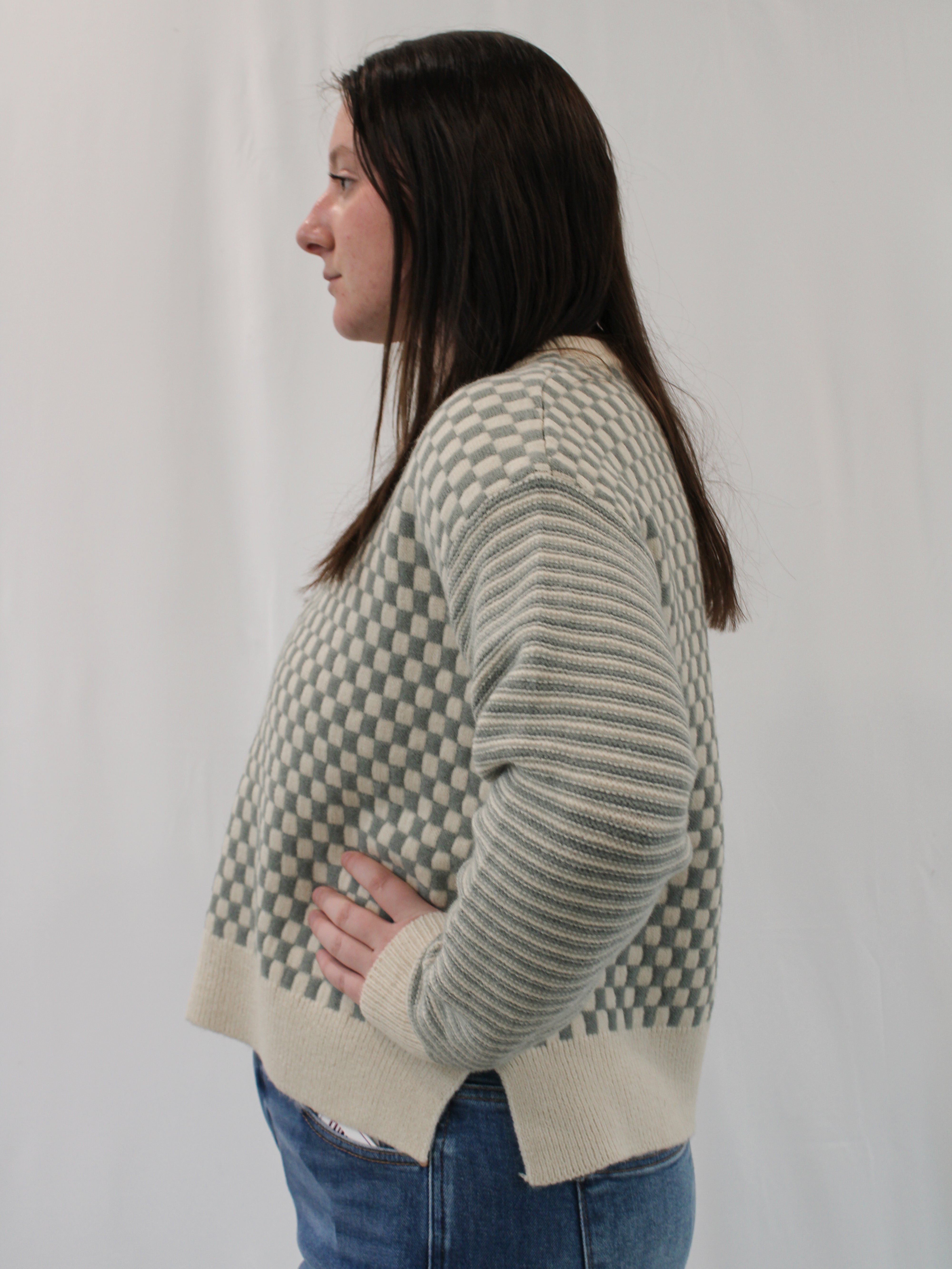 Snuggle up in the SOFYA CHECKERED SWEATER, featuring a cozy oatmilk and sage checkerboard pattern. The crew neck adds a touch of classic style, perfect for a chilly day (or a Netflix binge).