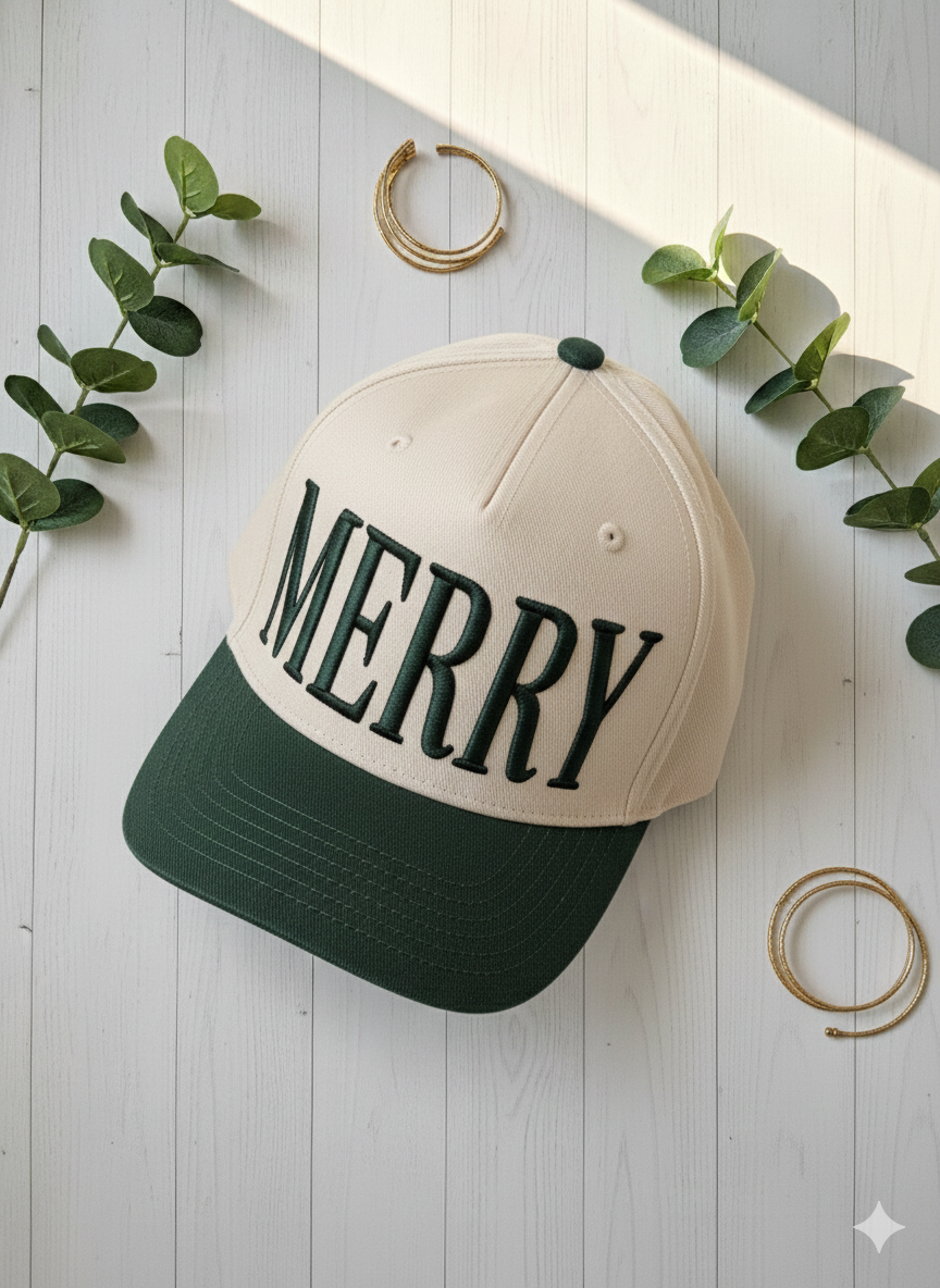Top off your holiday style with this cozy-chic taupe hat, embroidered with Merry in a rich forest green thread. Its neutral tone pairs perfectly with any winter outfit, while the festive stitching adds just the right touch of seasonal charm.