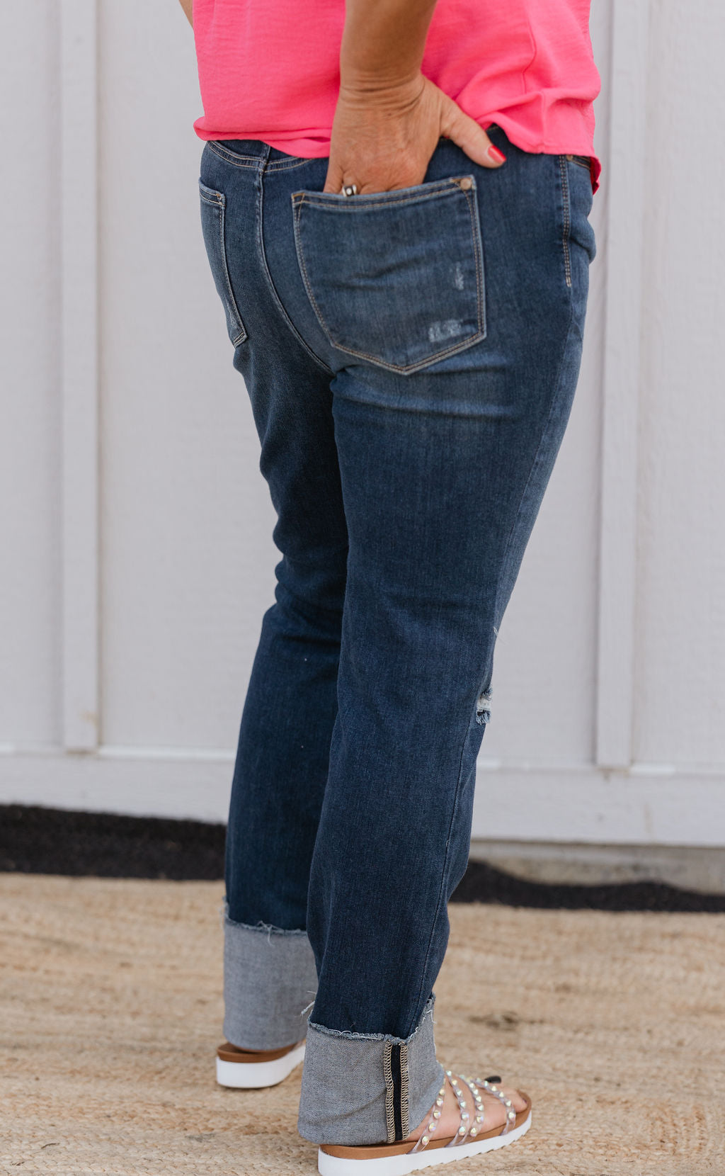 MOLLY MID RISE DARK WASHED DISTRESSED STRAIGHT DENIM