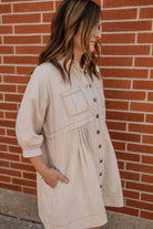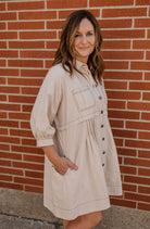Introduce Lula: a playful, 100% cotton, bone-colored dress with a button-down collar and trendy 3/4 sleeves. Easy to dress up or down for any occasion, you'll be reaching for this dress every chance you get!
