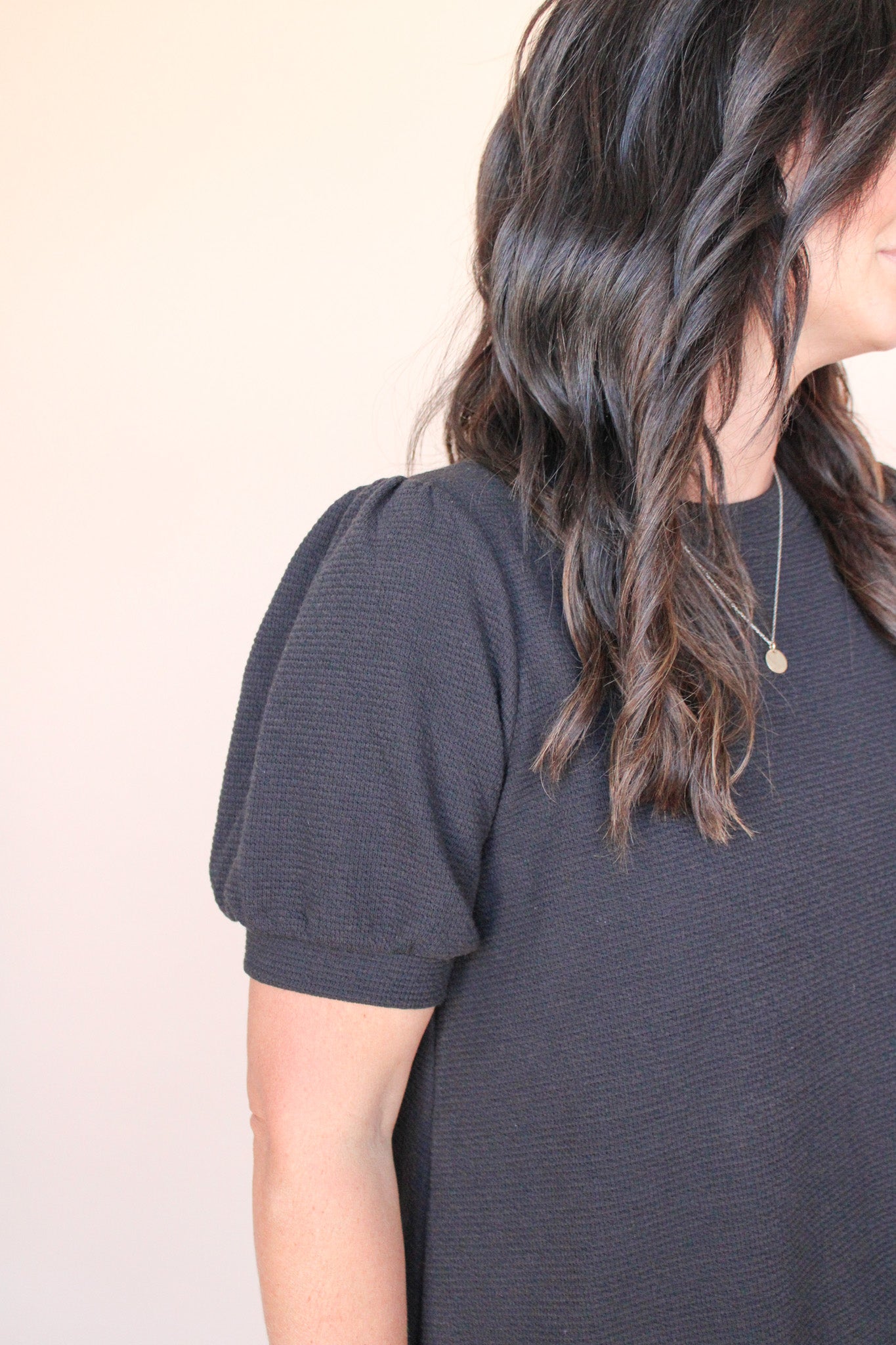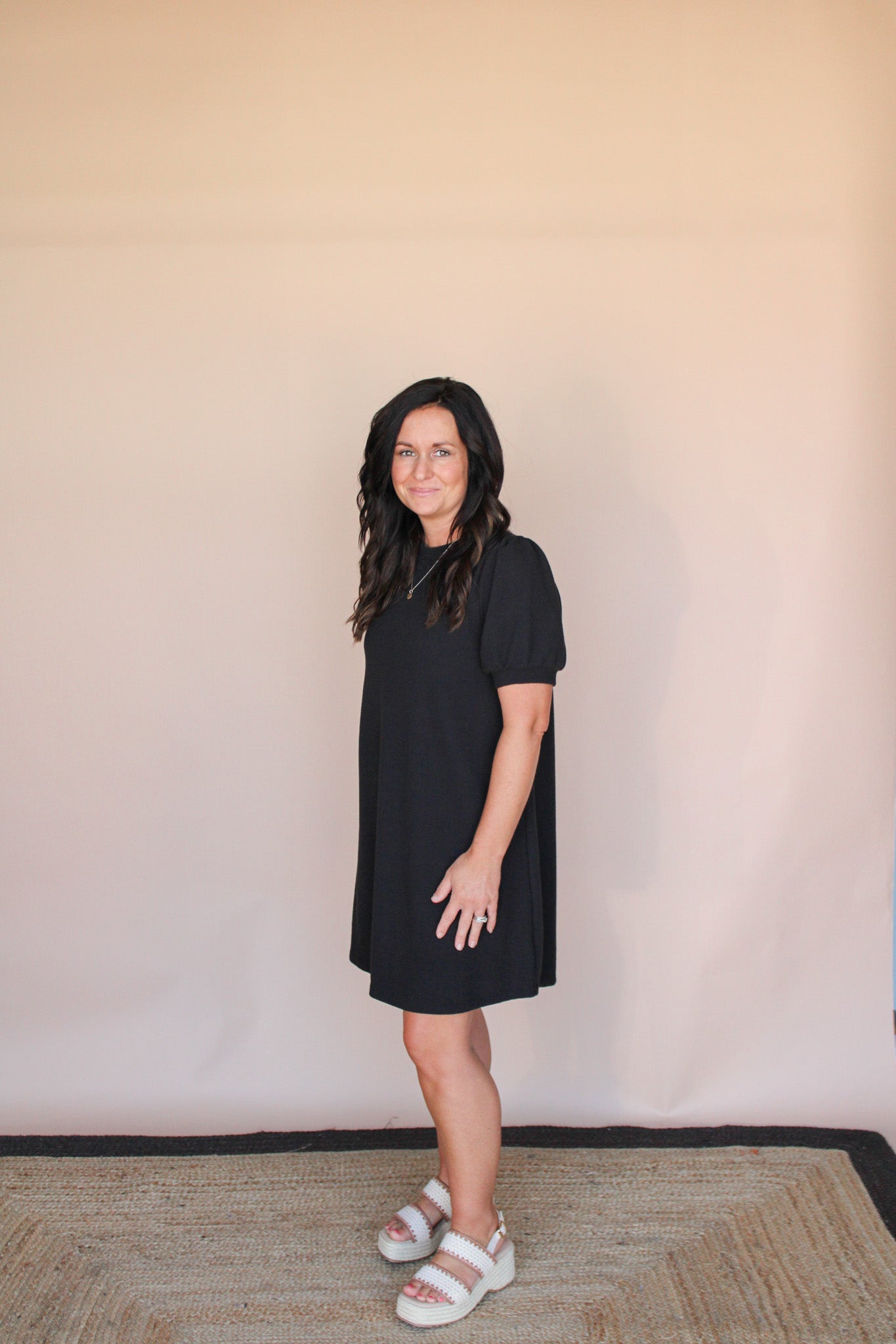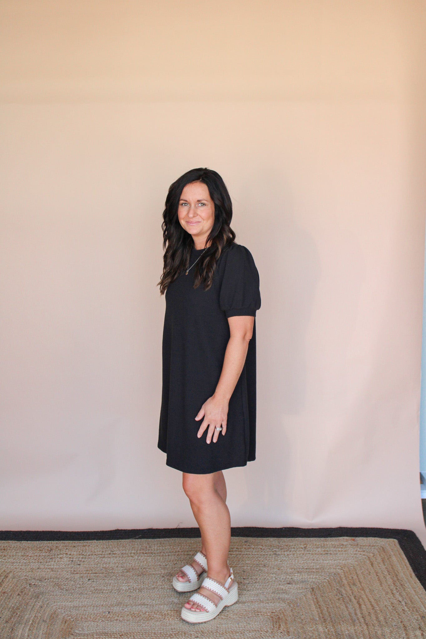 This playful mini dress features a cozy black rib knit fabric that hugs your silhouette just right. The puff sleeves add a fun, flirty touch, while the round neck keeps it effortlessly chic. Perfect for day-to-night wear, it’s a stylish choice for those who love a little volume and a whole lot of confidence.