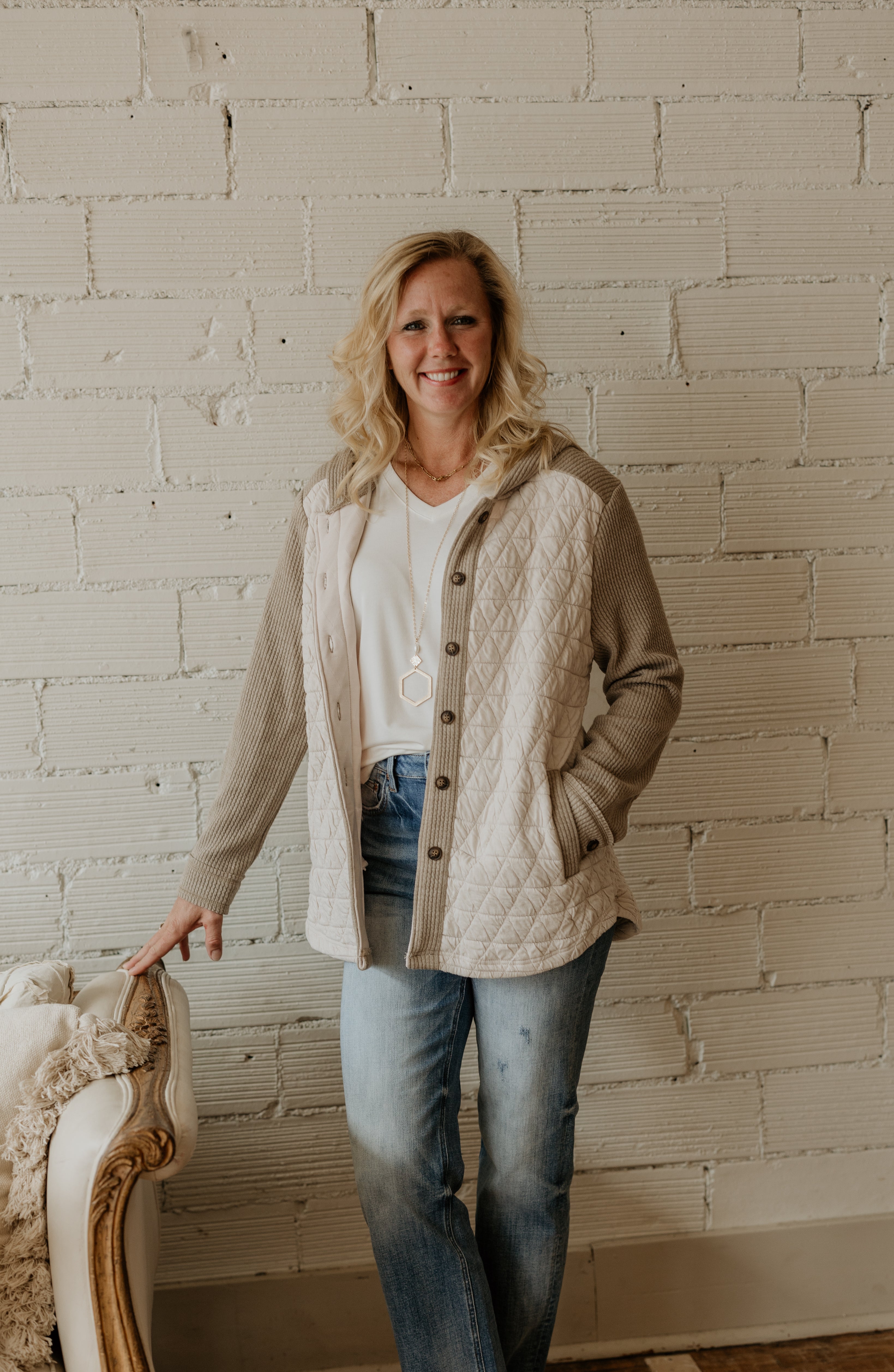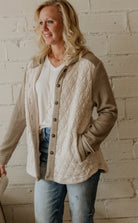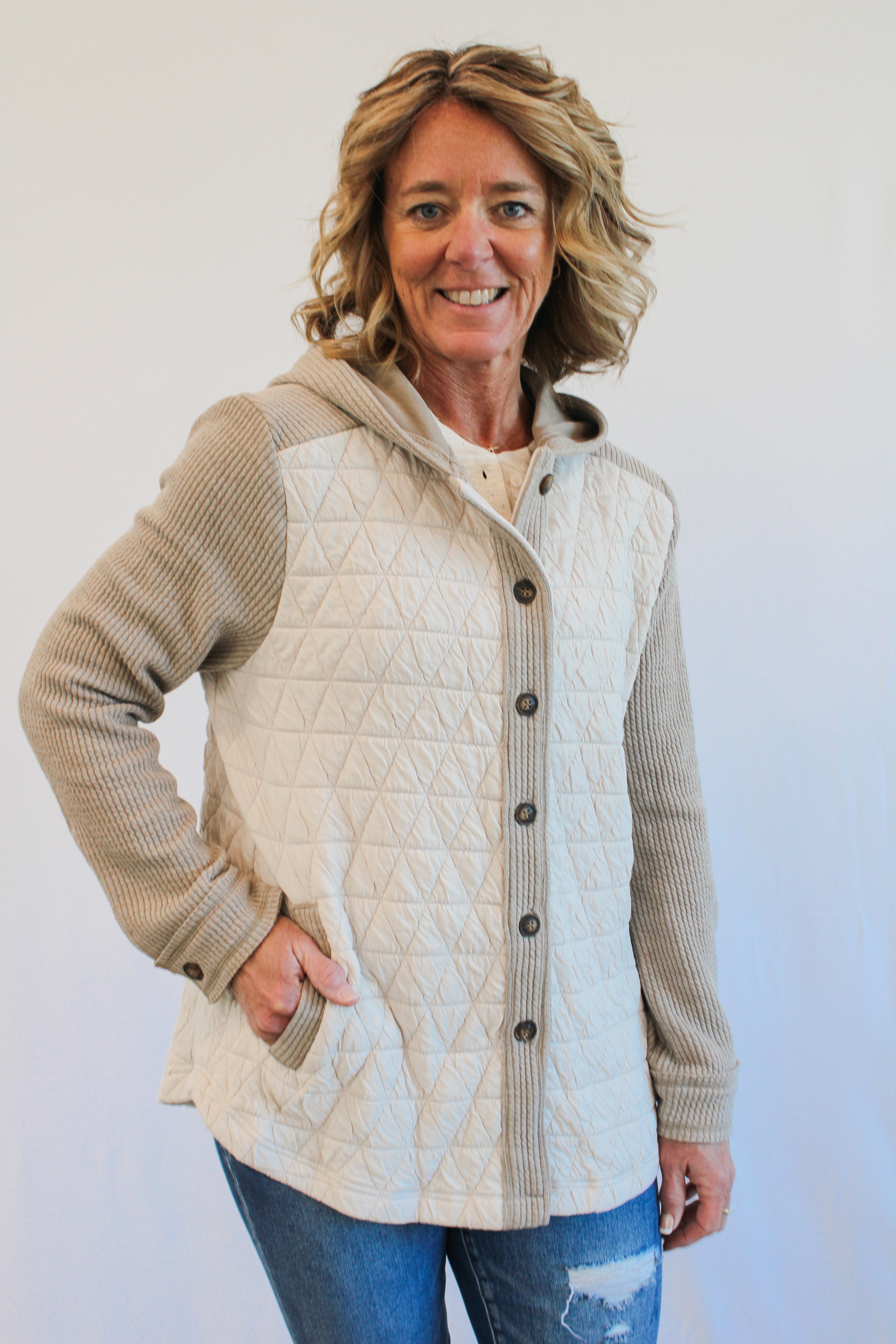Stay cozy and stylish with the DEIDRA HOODED SWACKET. This unique design combines the comfort of a sweater with the functionality of a jacket, featuring a trendy hood and a button down front. The quilted fabric adds an extra layer of warmth to this taupe and otter colored piece.