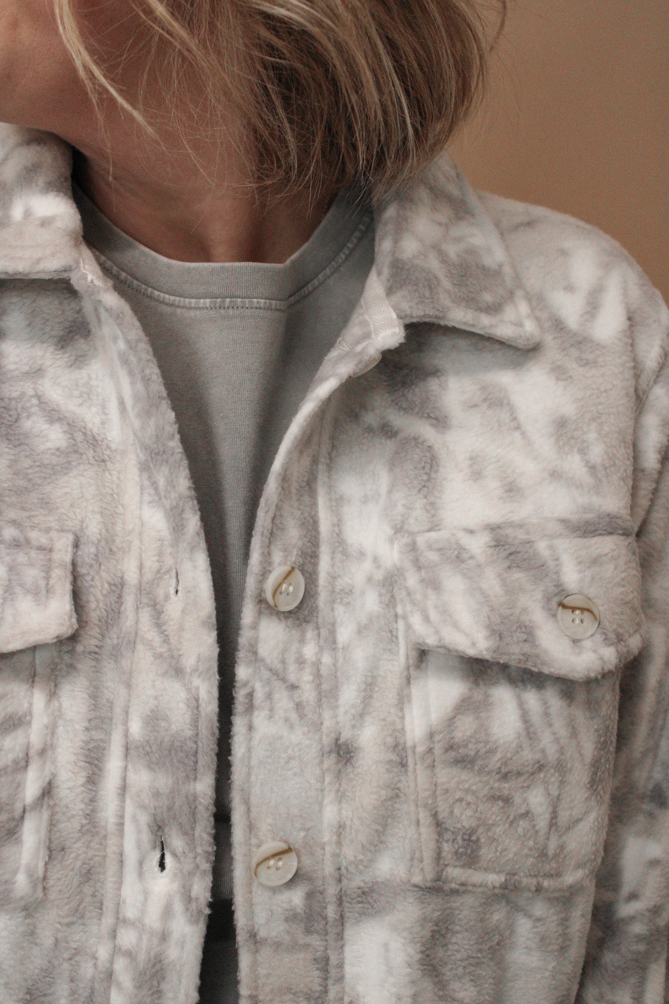 So plush and soft, this jacket is featured in an oversized fit, button front closer, side slits and dual side and chest pockets.