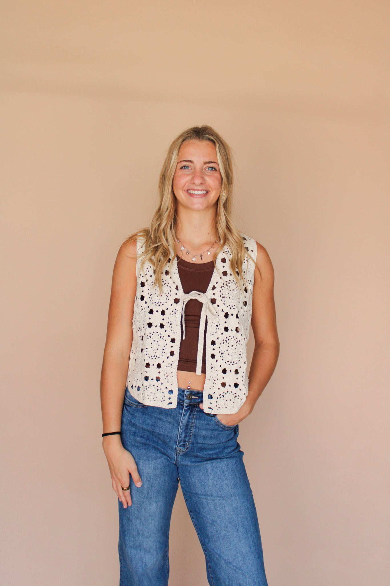 Stay effortlessly cool with the Sutton Crochet Vest. Crafted from 100% cotton, it offers breathable comfort for any season. The playful self-front tie adds a charming touch, making it perfect to layer over your favorite tops for a stylish, breezy look.