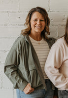 A sporty layer for going to and from workouts or just out and about, this jacket features a nylon windbreaker fabric, adjustable hoodie, and dual box side pockets with snap closures.