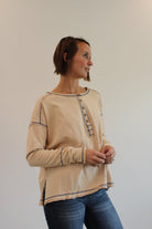 Get ready to elevate your casual style with the Rachelle Stitched Henley! Crafted from garment washed cotton, this top features defined stitching accents and functional buttons. The raw edge detail adds a touch of edginess to this otherwise classic piece. Perfect for a laid-back yet stylish look.