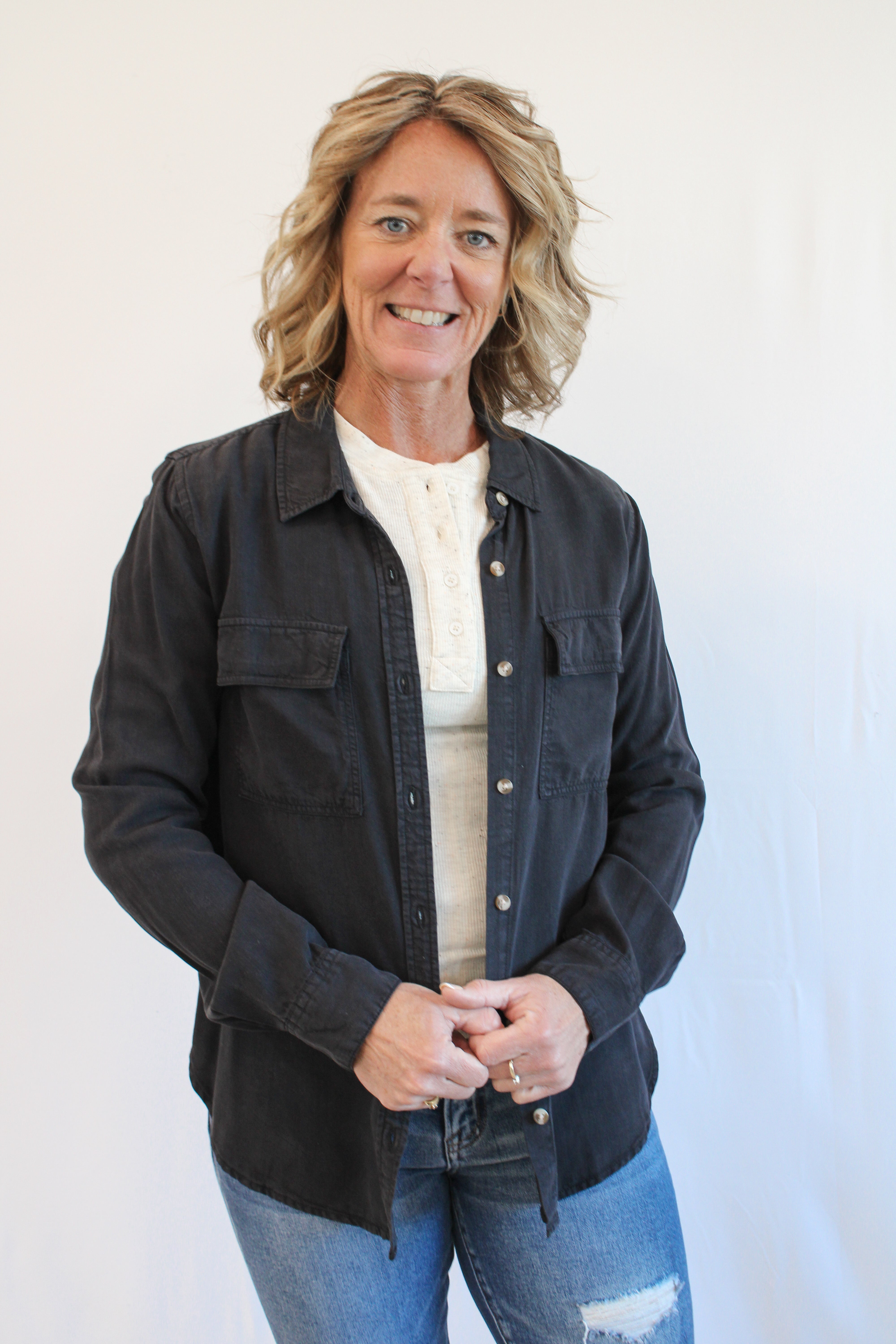 We are loving the cozy fabric on this Thread & Supply Radelyn Button Up Shirt for Women in Black! A staple in your everyday closet, you’ll love the button up front, soft lightweight material, and relaxed fit. Style this cutie with denim and sneakers to complete the look!