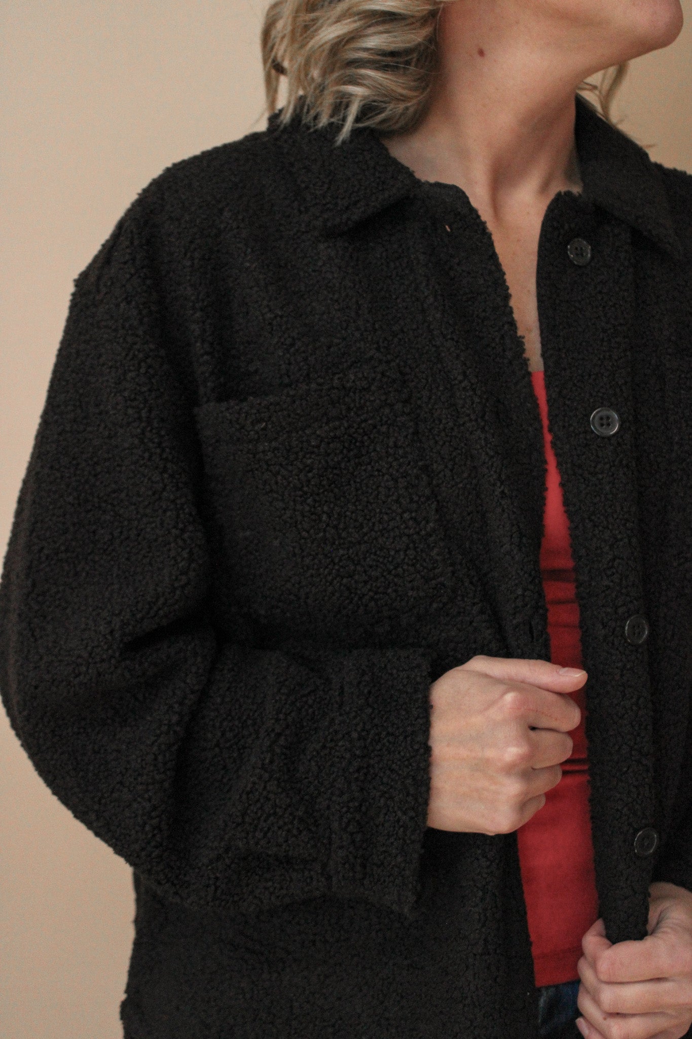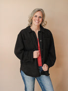 The FROSTLINE SHERPA SHACKET is your new go-to layer for looking effortlessly cool while staying cozy. Crafted with plush sherpa lining, this shacket delivers serious warmth without the bulk. The classic button closure keeps things secure and stylish, whether you're layering over a tee or pairing it with your favorite dress. Perfect for those moments when a jacket feels like too much but a sweater isn't quite enough. Embrace the trend and make comfort your fashion statement.