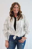 Get ready to slay the fashion game with the Jina Oversized Button Down! This soft wash striped top features a button down front, collared neckline, and buttoned cuffs for a chic look. With added seams for a slimming effect, this high-low design boasts two side slits and a chest pocket. Plus, its slightly oversized fit is perfect for a comfy, yet stylish outfit.