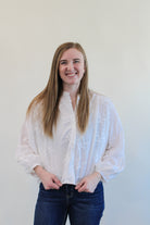 Unleash your floral fancy with the MEGHAN FLORAL APPLIQUE BLOUSE. This playful blouse features delicate floral appliques, perfect for adding a pop of color and texture to any outfit. The long sleeves and button-down design add a touch of elegance to this quirky piece. (Floral appliques included - no green thumb required!)