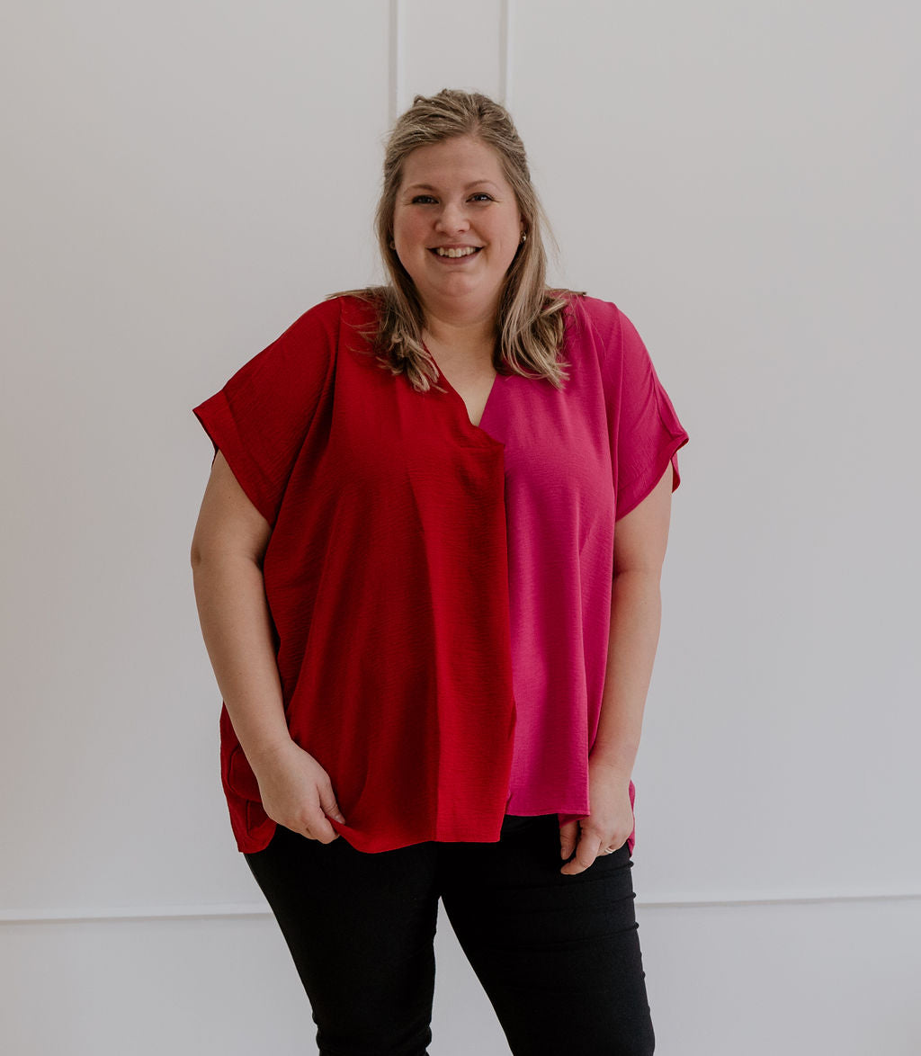 RUBIE COLORBLOCK CURVY BLOUSE PINK & RED