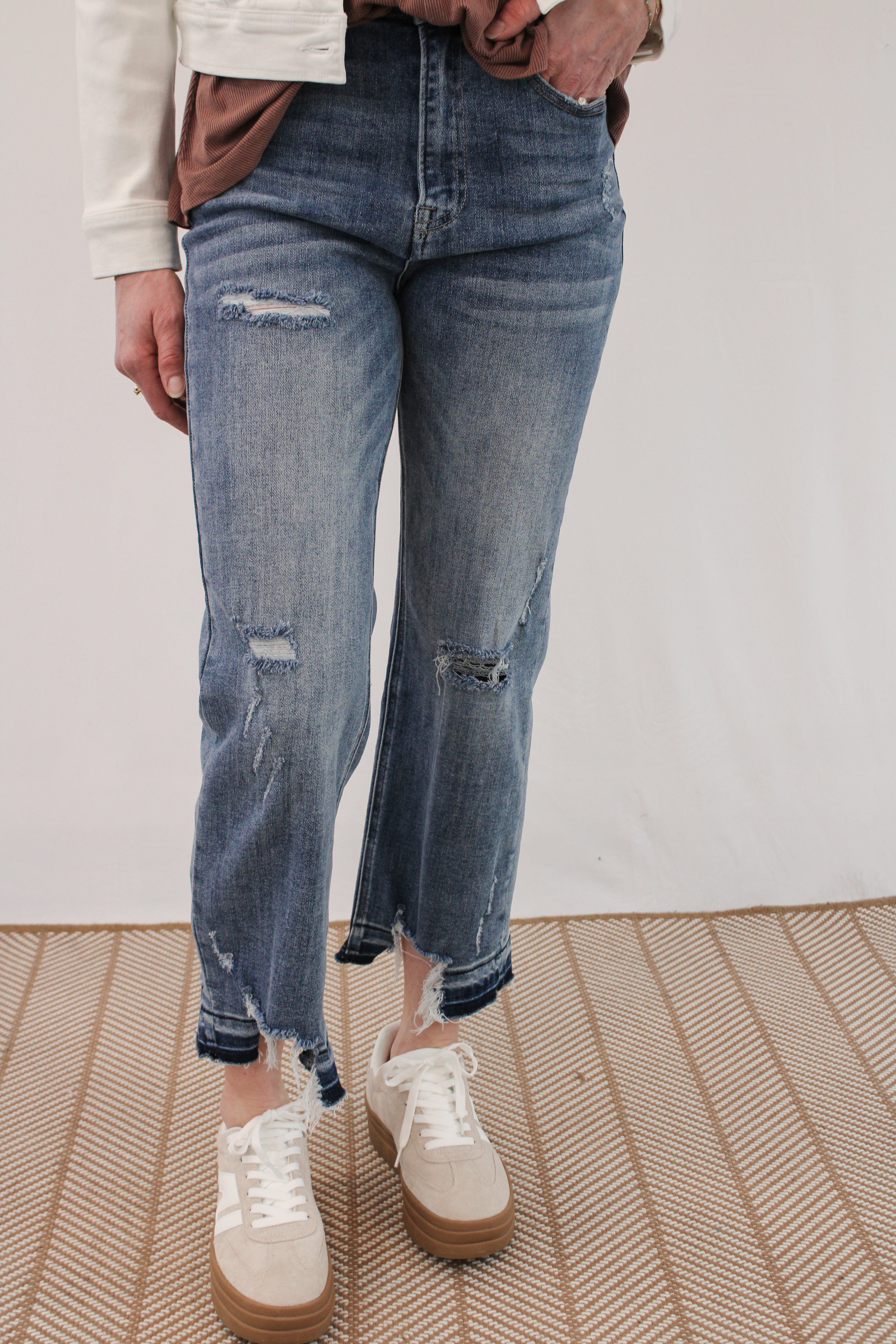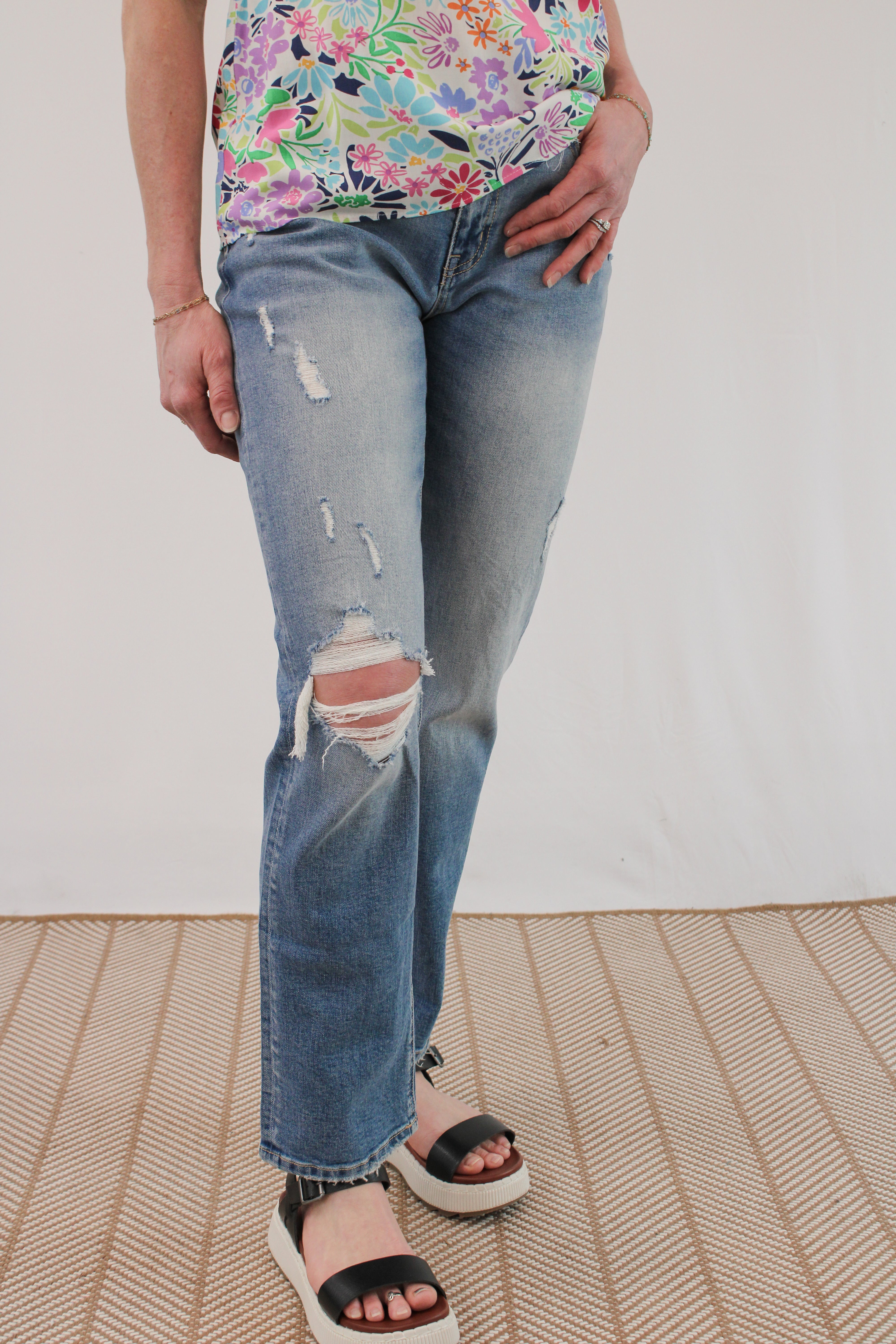 ELAINE MEDIUM MID RISE SLIM STRAIGHT DISTRESSED JEANS