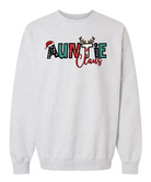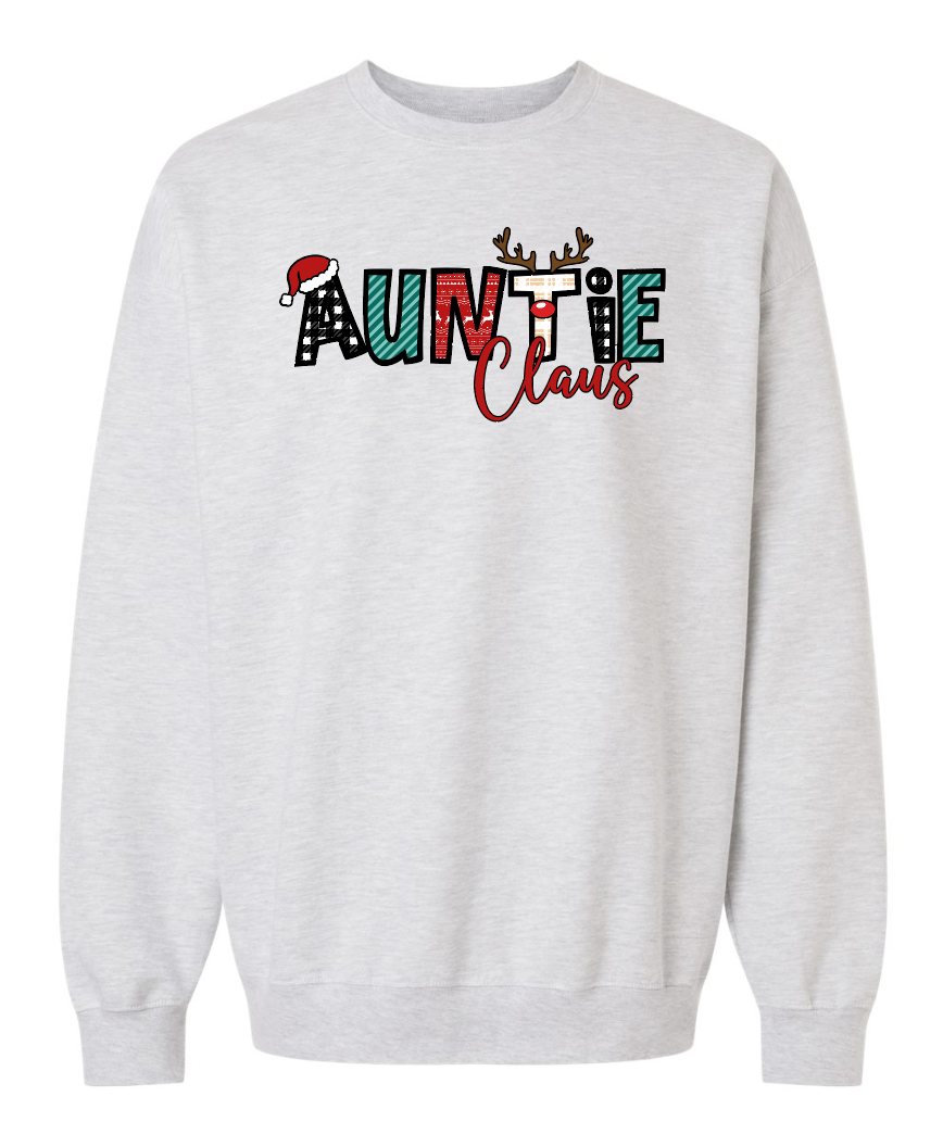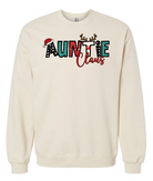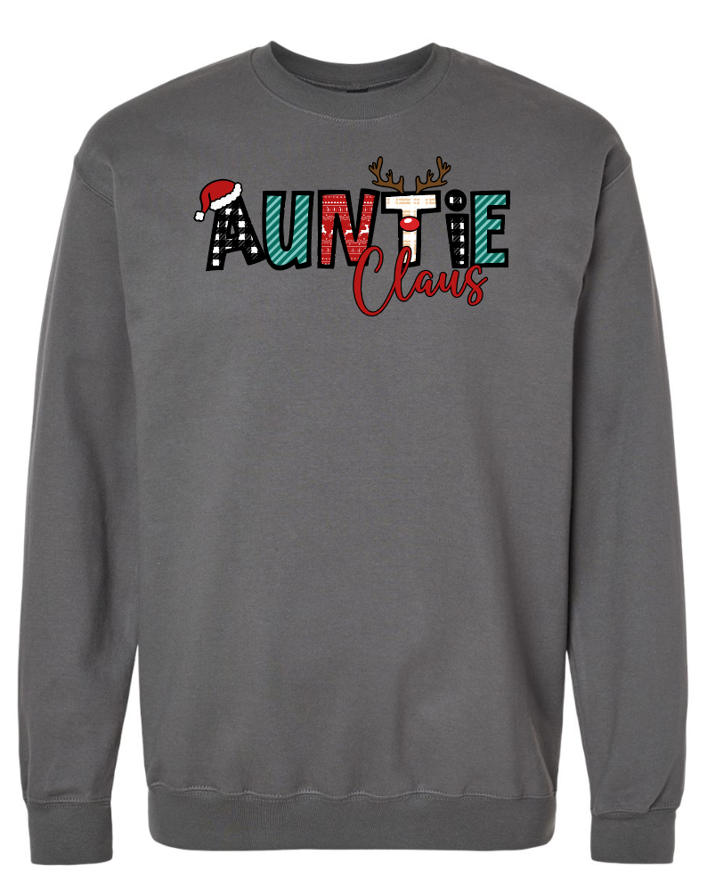 Get festive in style with our Auntie Claus crewneck — the perfect holiday sweatshirt for every proud aunt! Featuring bold patterned lettering, a Santa-hat accent, and a playful Rudolph-inspired “T,” this cozy sweatshirt brings holiday cheer to any gathering.