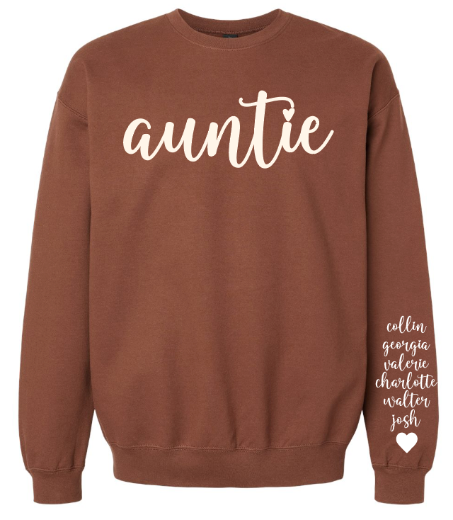 Meet the coziest way to show off your favorite title—Auntie. This crewneck features script lettering and customizable details to make it uniquely yours. Soft, durable, and perfectly oversized, it’s made for family gatherings, weekend outings, and every moment you’re loving that Auntie life.