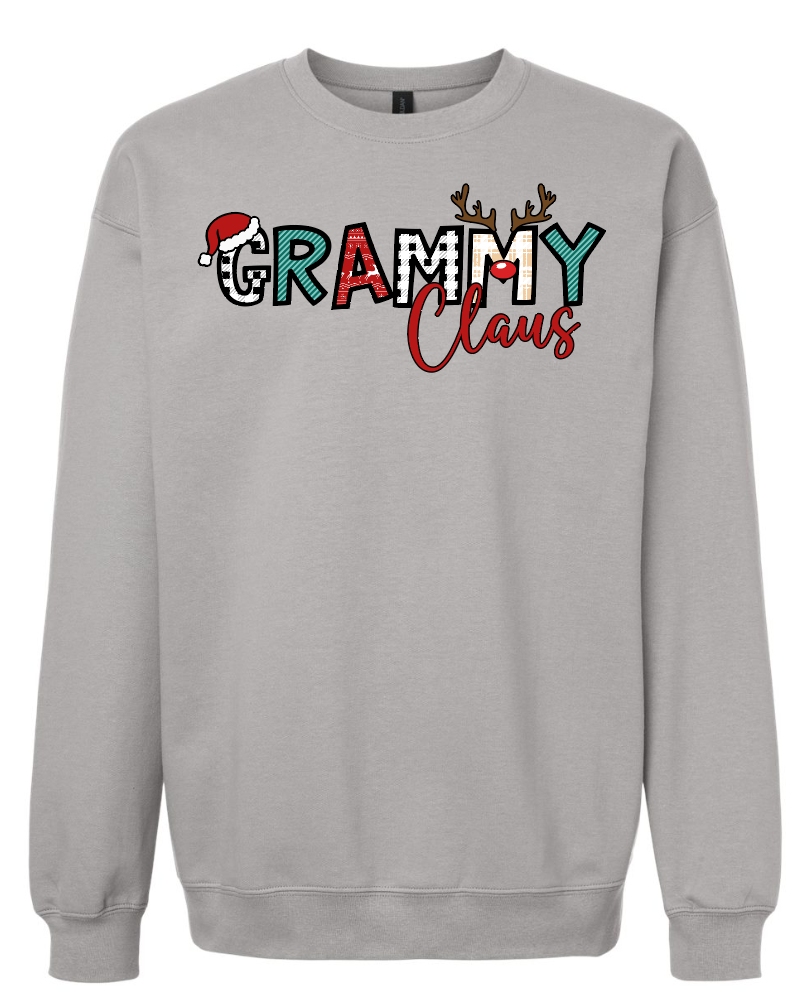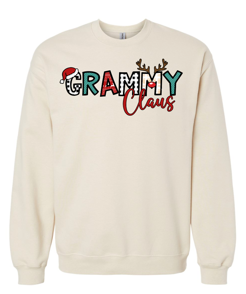 Get festive in style with our Grammy Claus crewneck — the perfect holiday sweatshirt for every proud aunt! Featuring bold patterned lettering, a Santa-hat accent, and a playful Rudolph-inspired “T,” this cozy sweatshirt brings holiday cheer to any gathering.