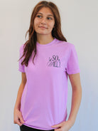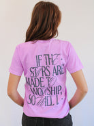 IF THE STARS ARE MADE TO WORSHIP, SO WILL I imprinted in black glitter on a neon violet Comfort Colors crewneck t-shirt. Perfect to layer under pr wear alone.