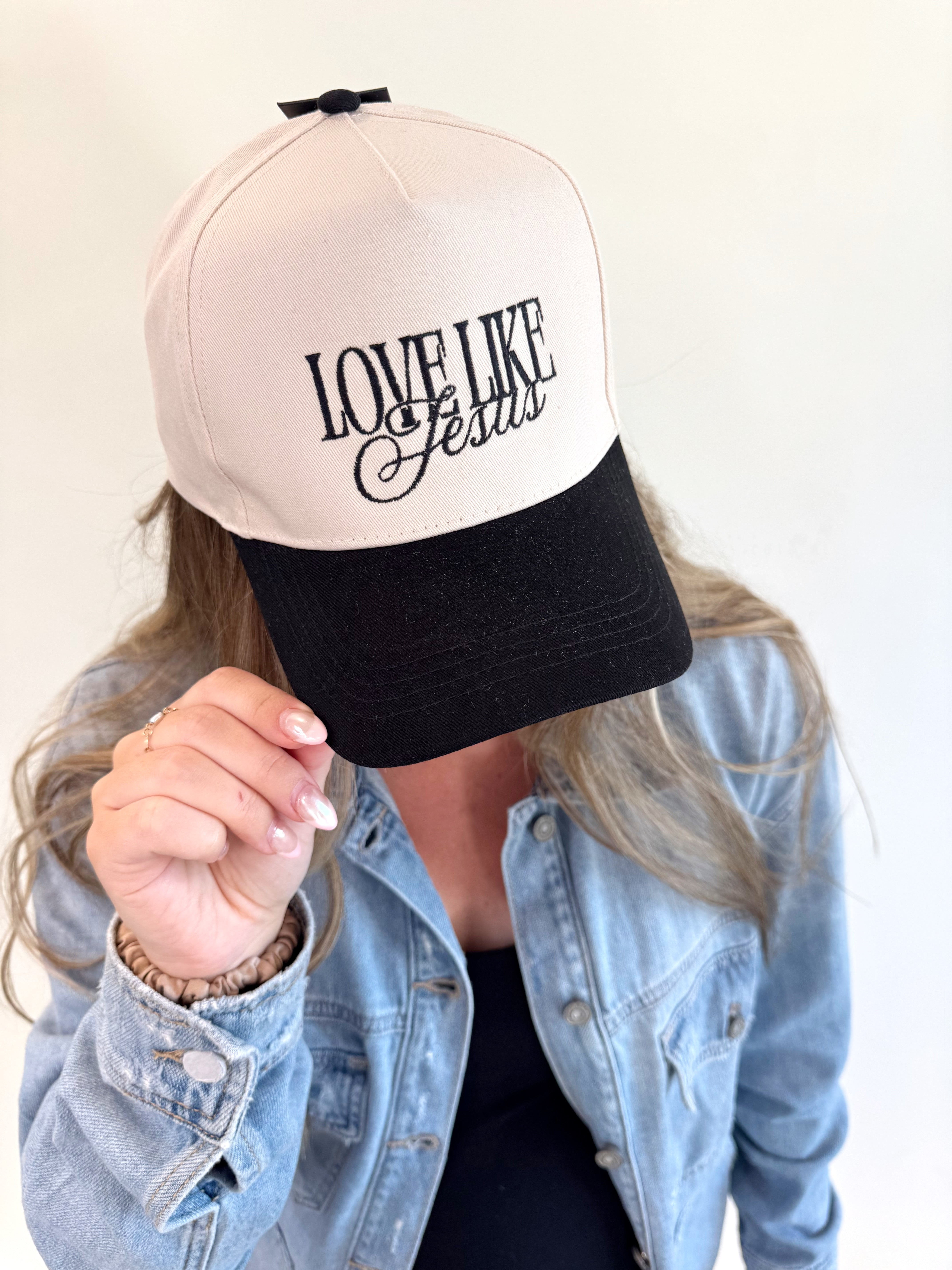Make a bold and meaningful statement with our Love Like Jesus Trucker Hat. Designed with a clean cream front panel and a classic black brim, this cap features elegant black embroidery that reminds us to lead with love. The timeless color combo and adjustable fit make it a versatile staple for everyday wear.