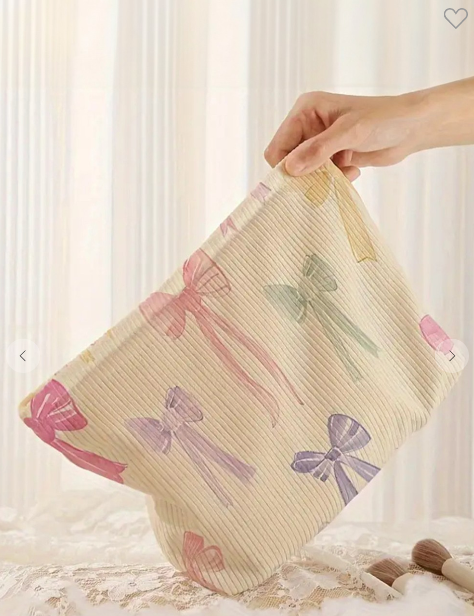 Adorned with a charming bow knot print for a touch of elegance. Features a convenient zipper closure for easy access to your items. Crafted from soft corduroy material for a luxurious feel.