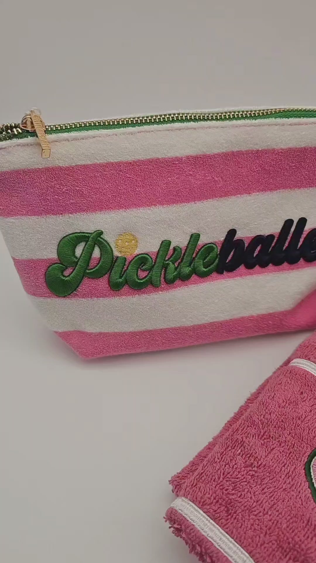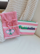 Features soft luxurious fabric, bright pink color, and an embroidered pickleball themed design