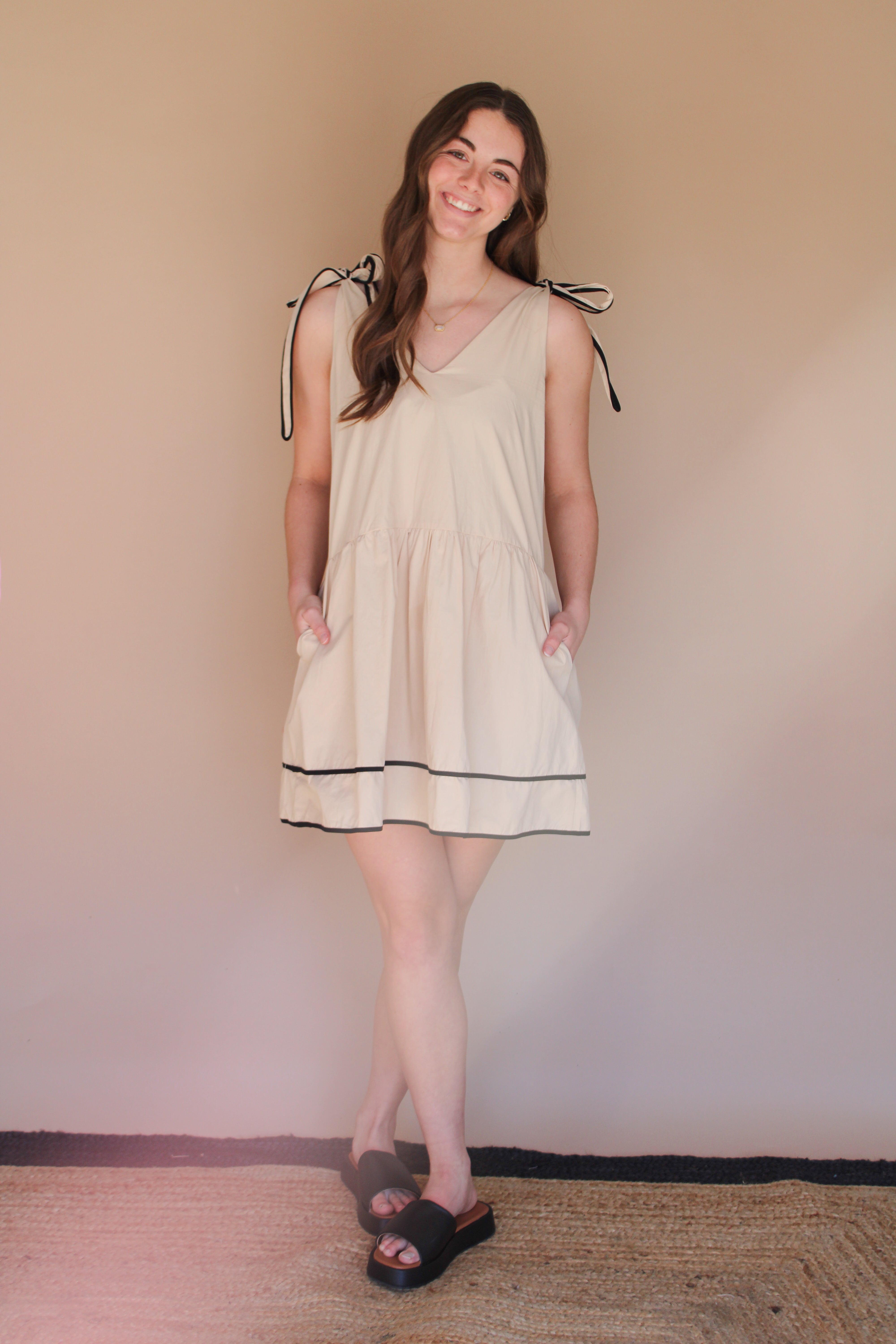 The JUDE BOW TIE TANK DRESS by Ivy & Co features charming self-tie shoulder straps that add a flirty touch to your look. This mini dress is lined for comfort and includes handy side pockets, perfect for keeping essentials close while you dance through your day. Playful and practical, it’s a stylish choice for sunny adventures or casual outings.