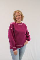 Stay cozy and stylish with the Maggie Contrast Seam Sweater by Ivy & Co! This relaxed fit sweater features a crew neckline, drop shoulder, and balloon sleeves. The contrasting seam detail adds a unique touch while the ribbed edges provide a comfortable fit. Perfect for those chilly days!