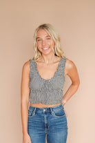 Embrace your sweet side in the SELENE GINGHAM CROP TANK! This playful piece features an adorable gingham pattern, flirty scoop neckline, and sleeveless design perfect for sunny days. The shirred bodice creates a flattering silhouette while the snug-fitting cropped hem shows just the right amount of skin. Pair with high-waisted bottoms for an irresistibly cute look!