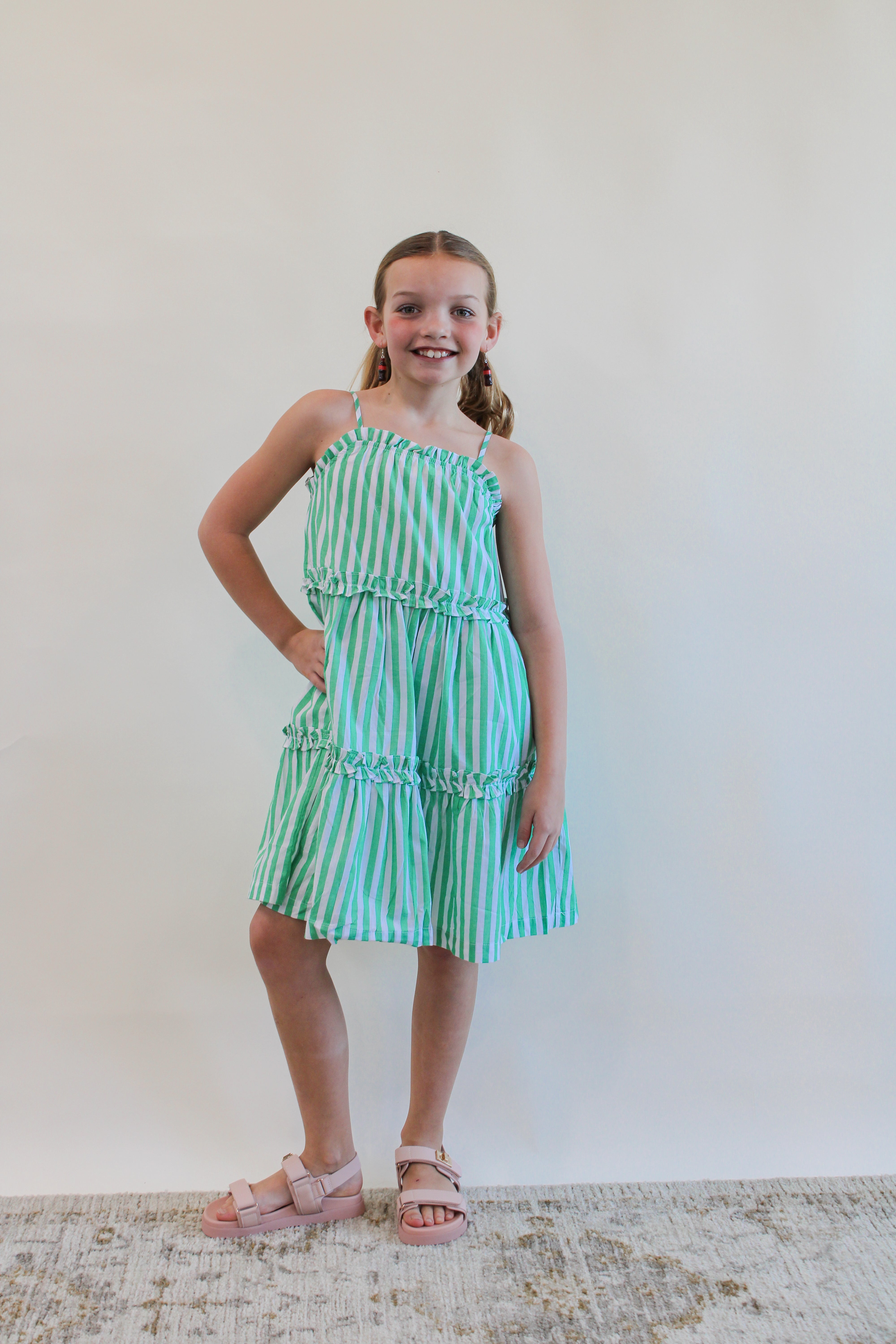 Get ready to make a statement with our ZARA Girls Striped Tank Dress! Made with a fun and playful ruffle trimmed poplin stripe fabric, this dress features tie shoulders and charming ruffle details. Perfect for any occasion, your little one will love twirling in this dress!