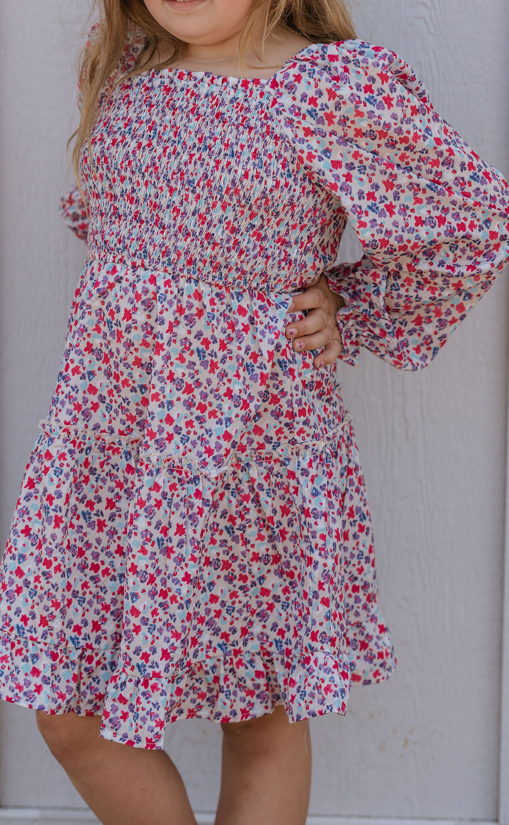 SHAY GIRLS PINK PURPLE AND BLUE FLORAL 3/4 SLEEVE DRESS