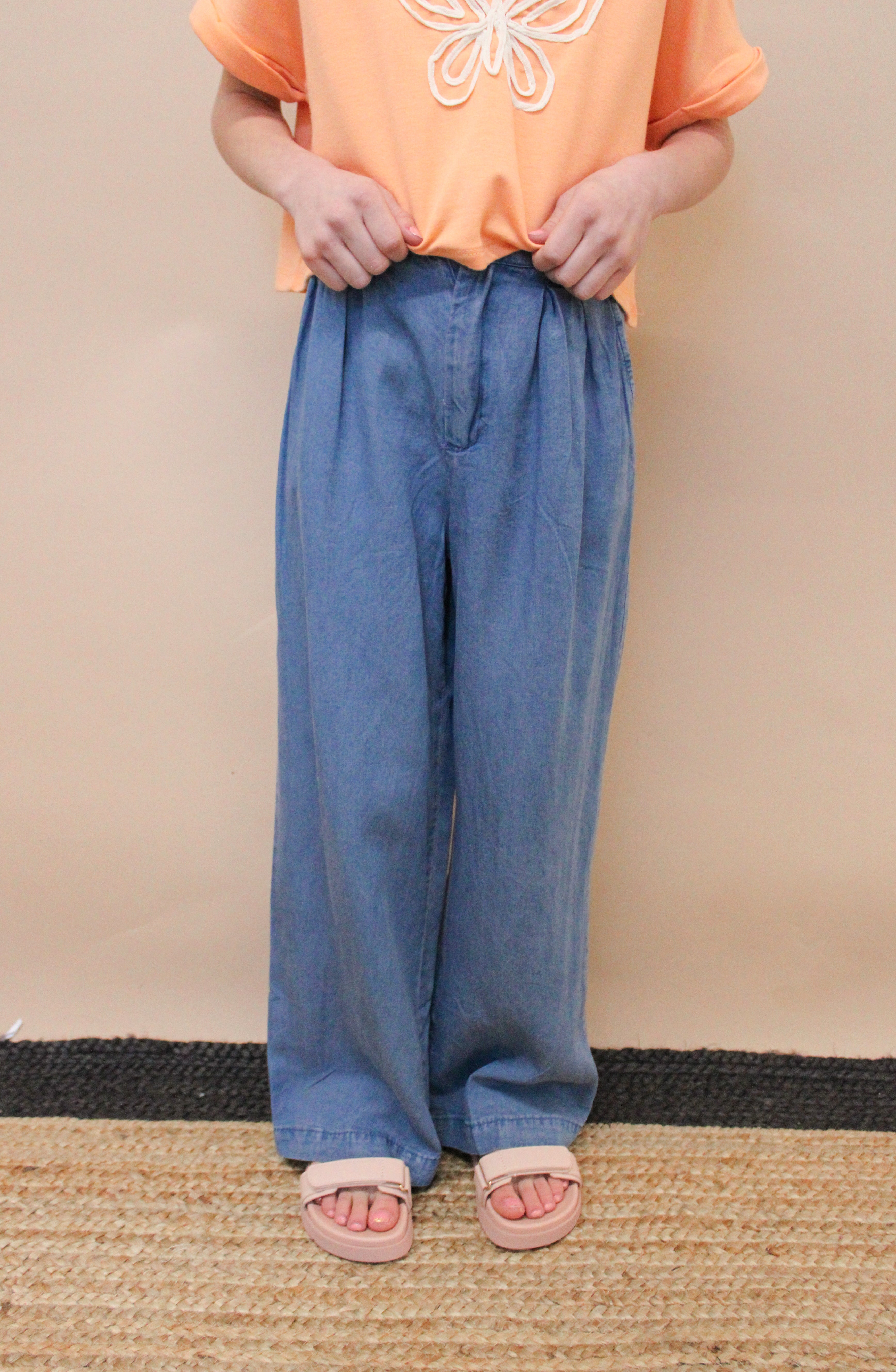 These girls' pants feature a washed denim fabric, wide leg design, and playful pleated detail. Perfect for any fun-loving fashionista, they offer a comfortable fit and stylish look. Add a touch of quirkiness to your wardrobe with these wide leg tencel pants.