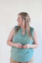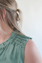 Flirt with fashion in our Cece Sleeveless Top. The sage color adds a touch of elegance, while the ruffled smocked shoulder and sleeveless design bring a playful and trendy edge. Perfect for a fun and stylish summer day out!