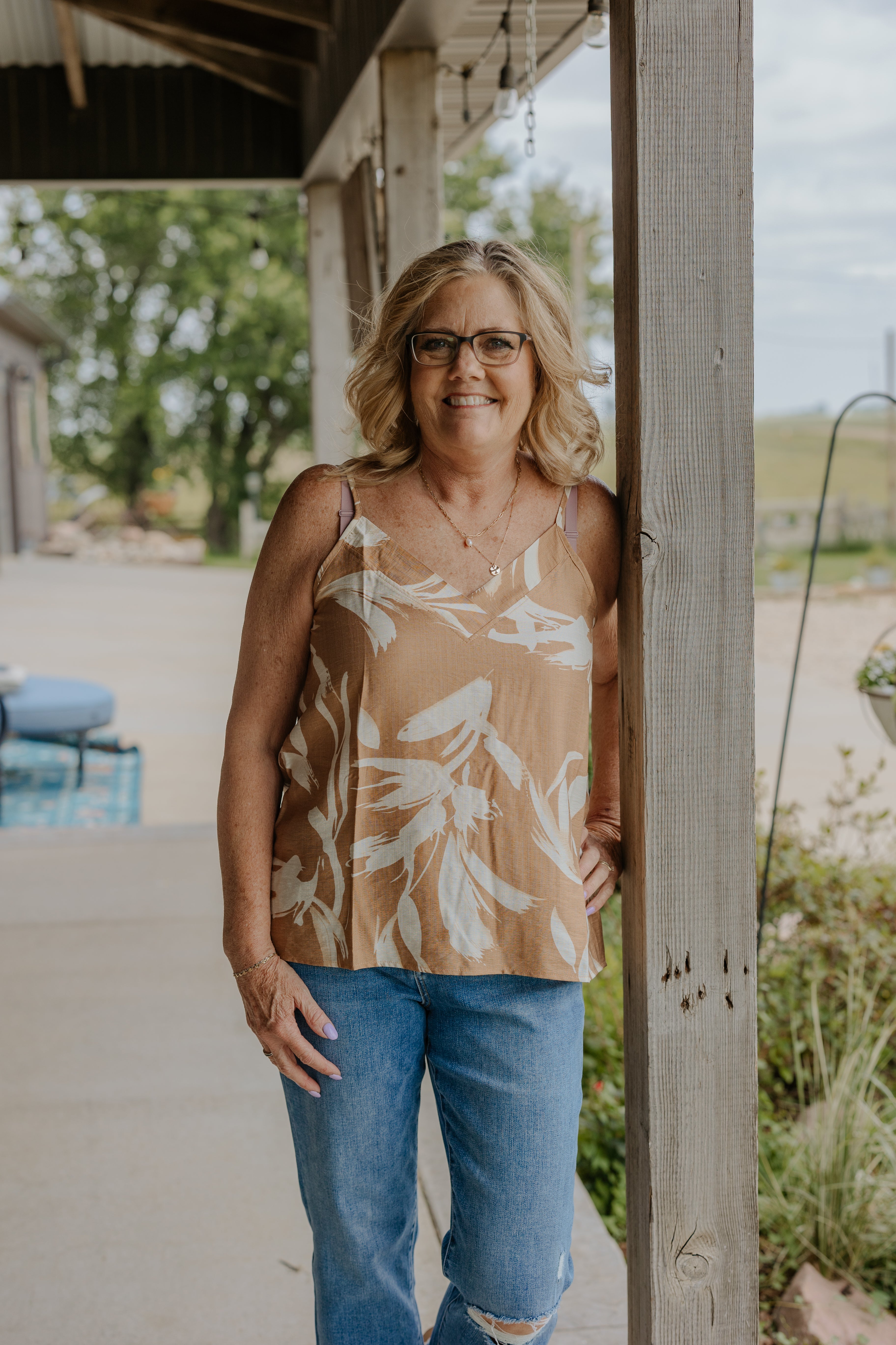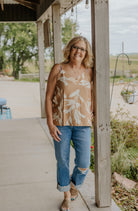 This playful tank features a flattering V-neck and adjustable straps for a perfect fit. The abstract floral pattern adds a fun, artistic touch to your casual wardrobe, making it an easy choice for sunny days and weekend adventures.