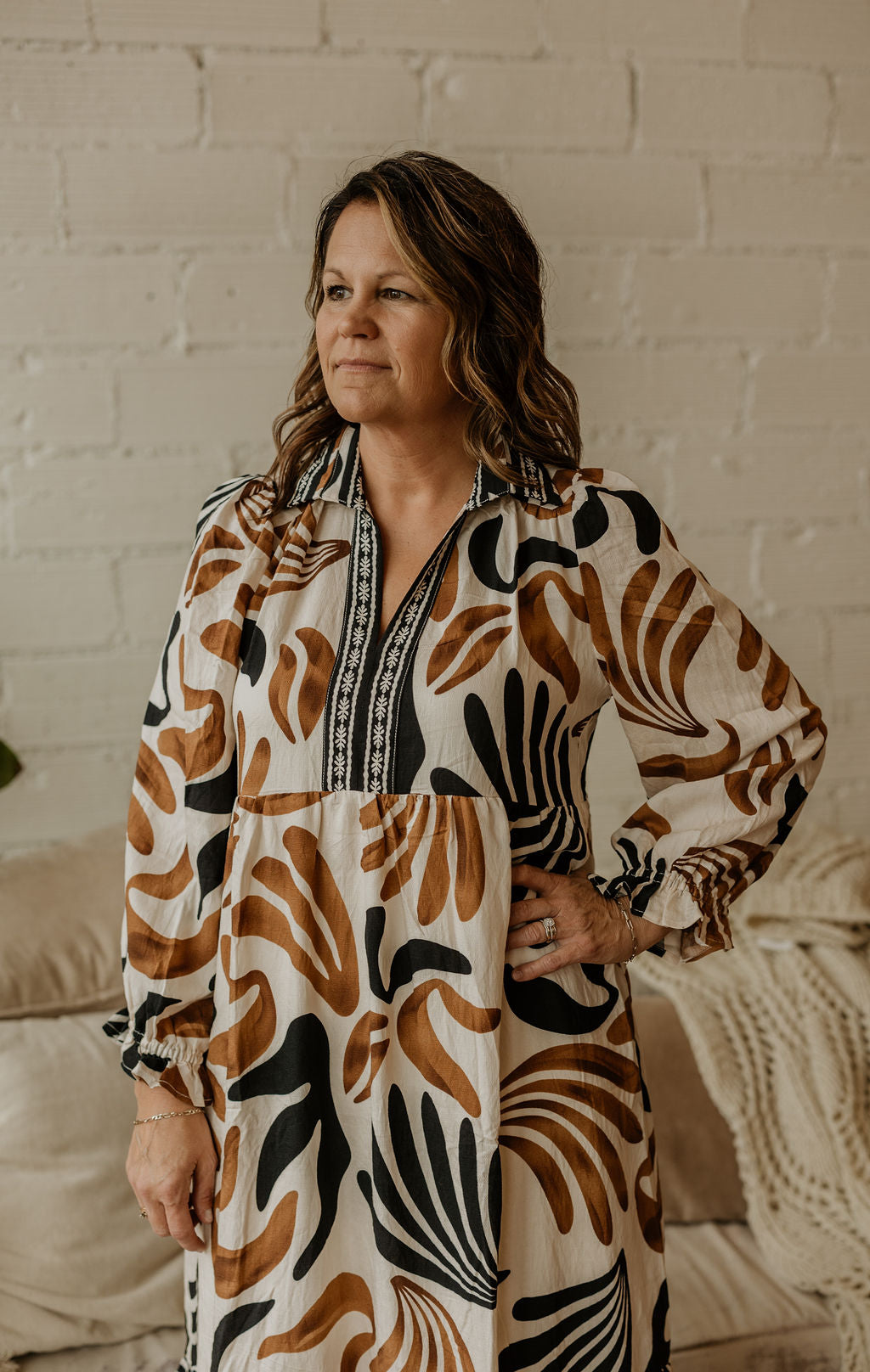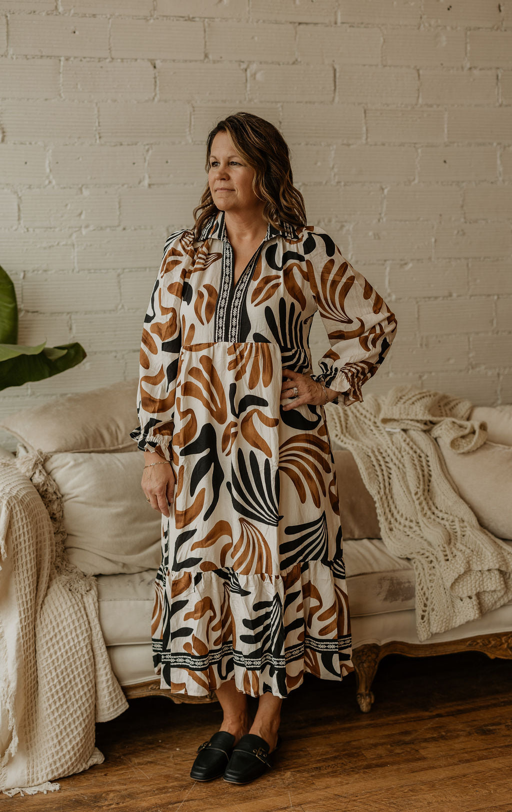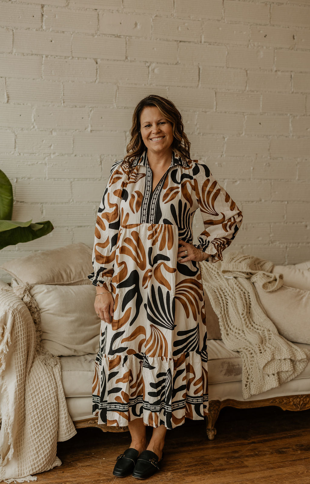 GRACIA ABSTRACT HALTER TIERED MIDI DRESS
