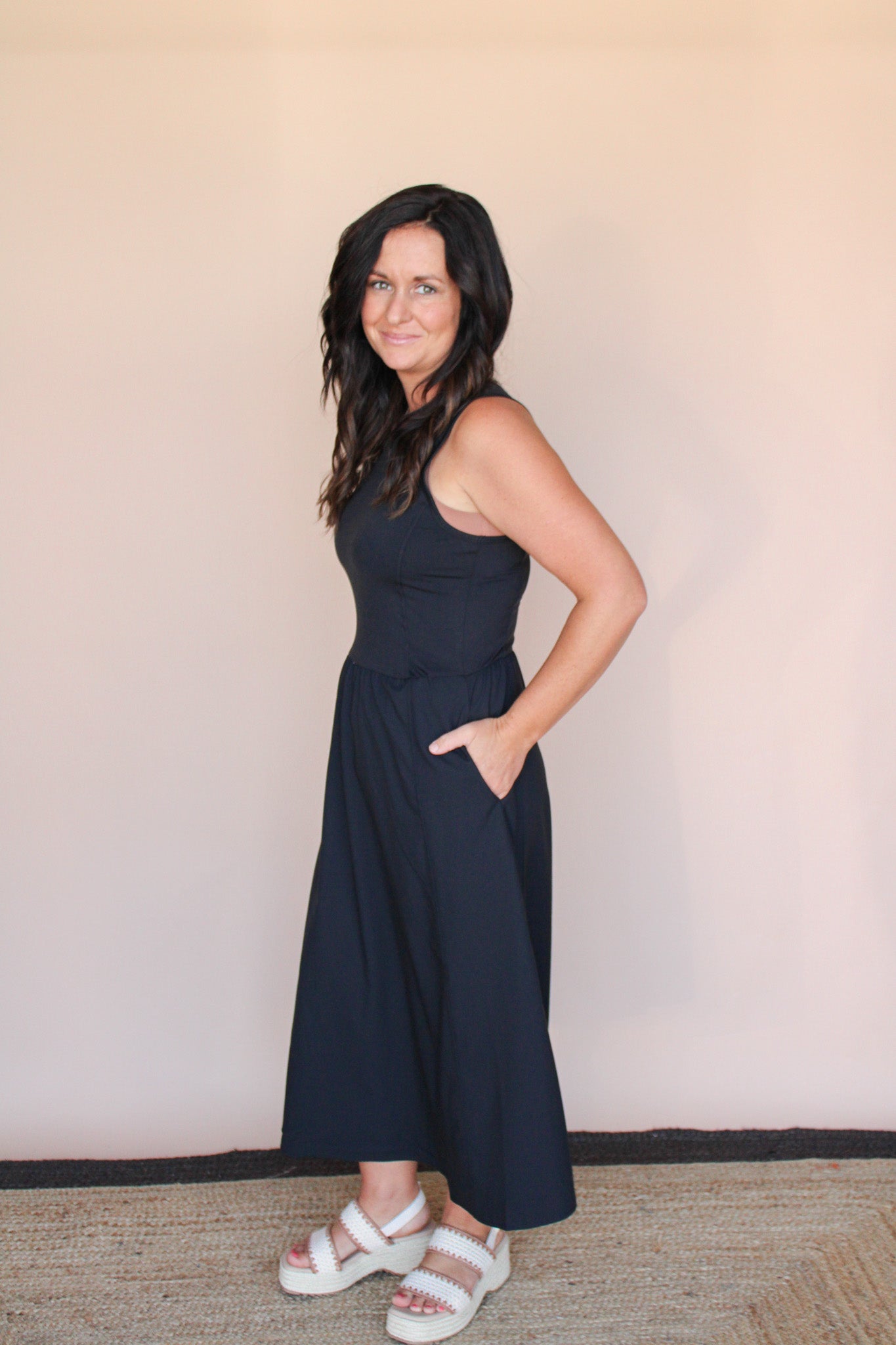ARI REG/CURVY ZIPPER FRONT MIDI DRESS