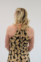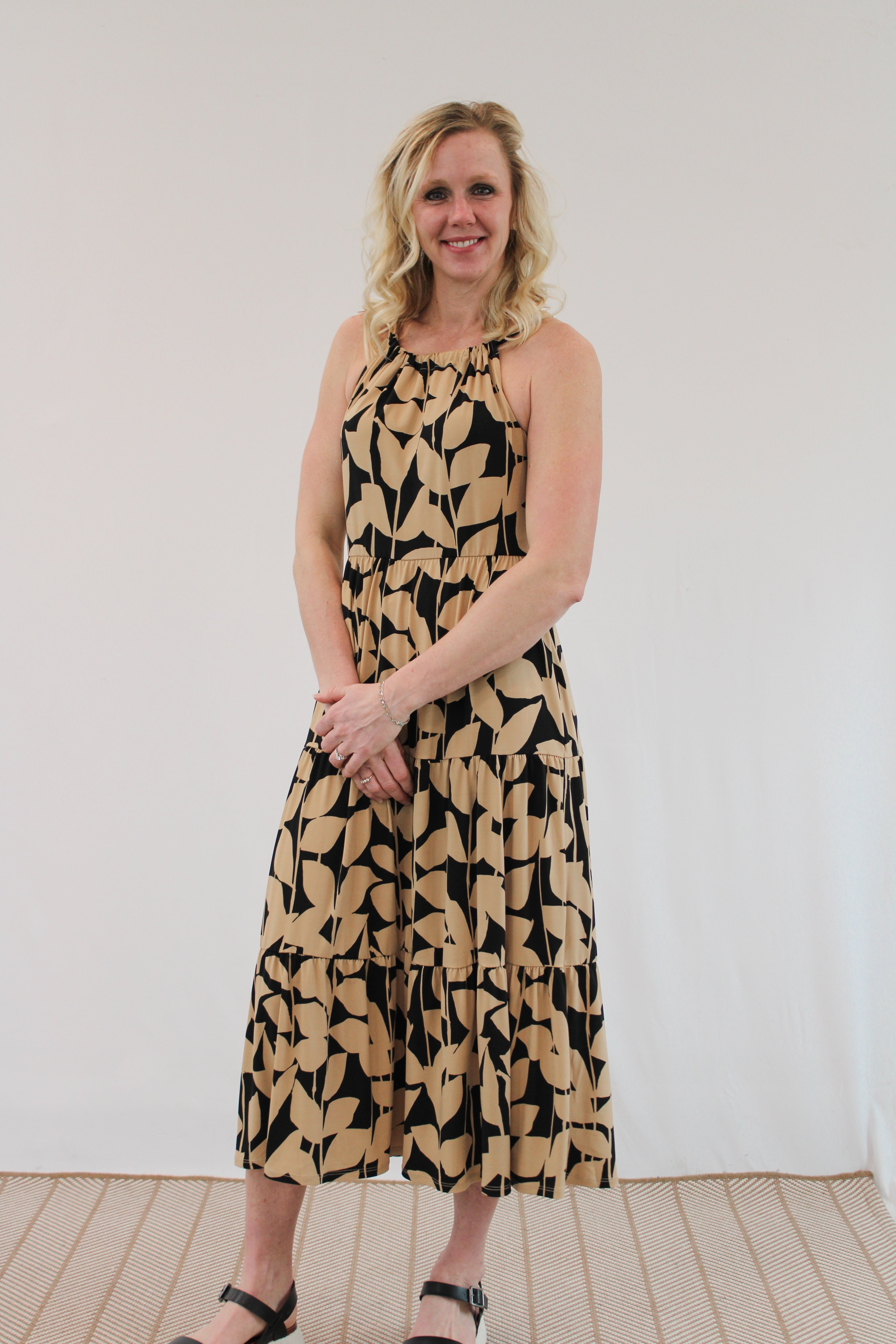 Stand out in style with the Gracia abstract halter tiered midi dress! Featuring a unique taupe and black design, this dress is perfect for layering and transitions effortlessly into fall. Get ready to turn heads with this statement piece!