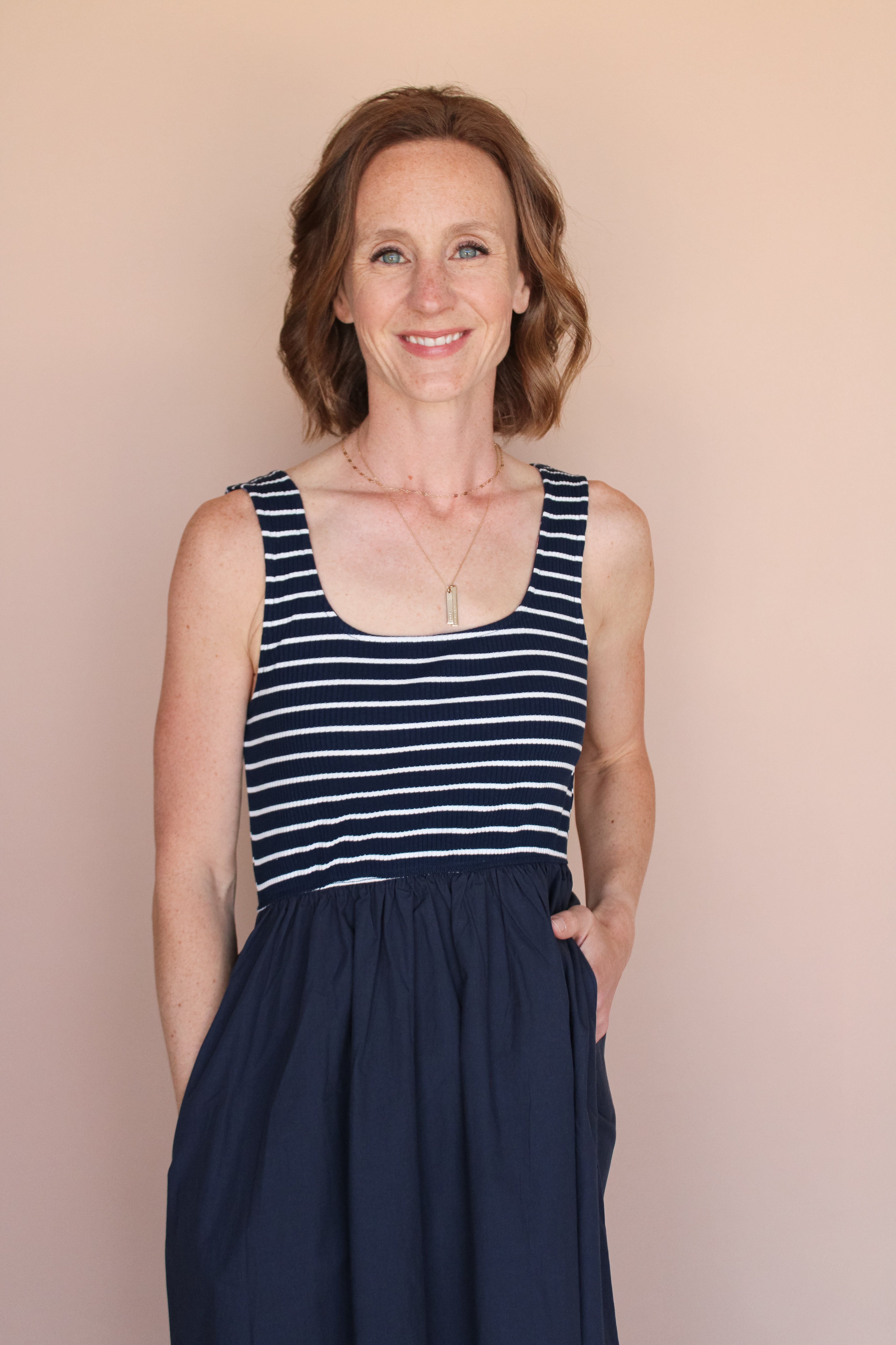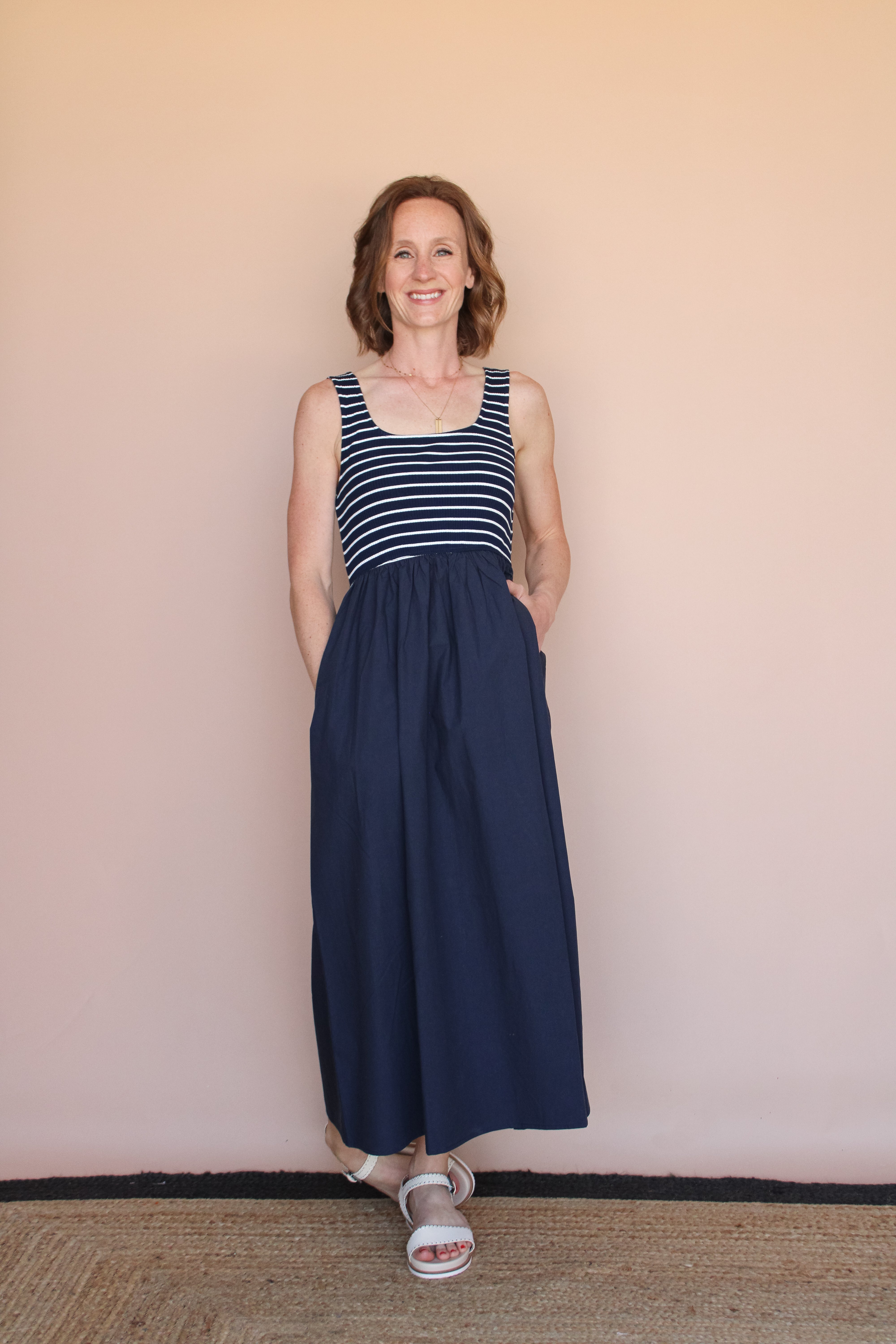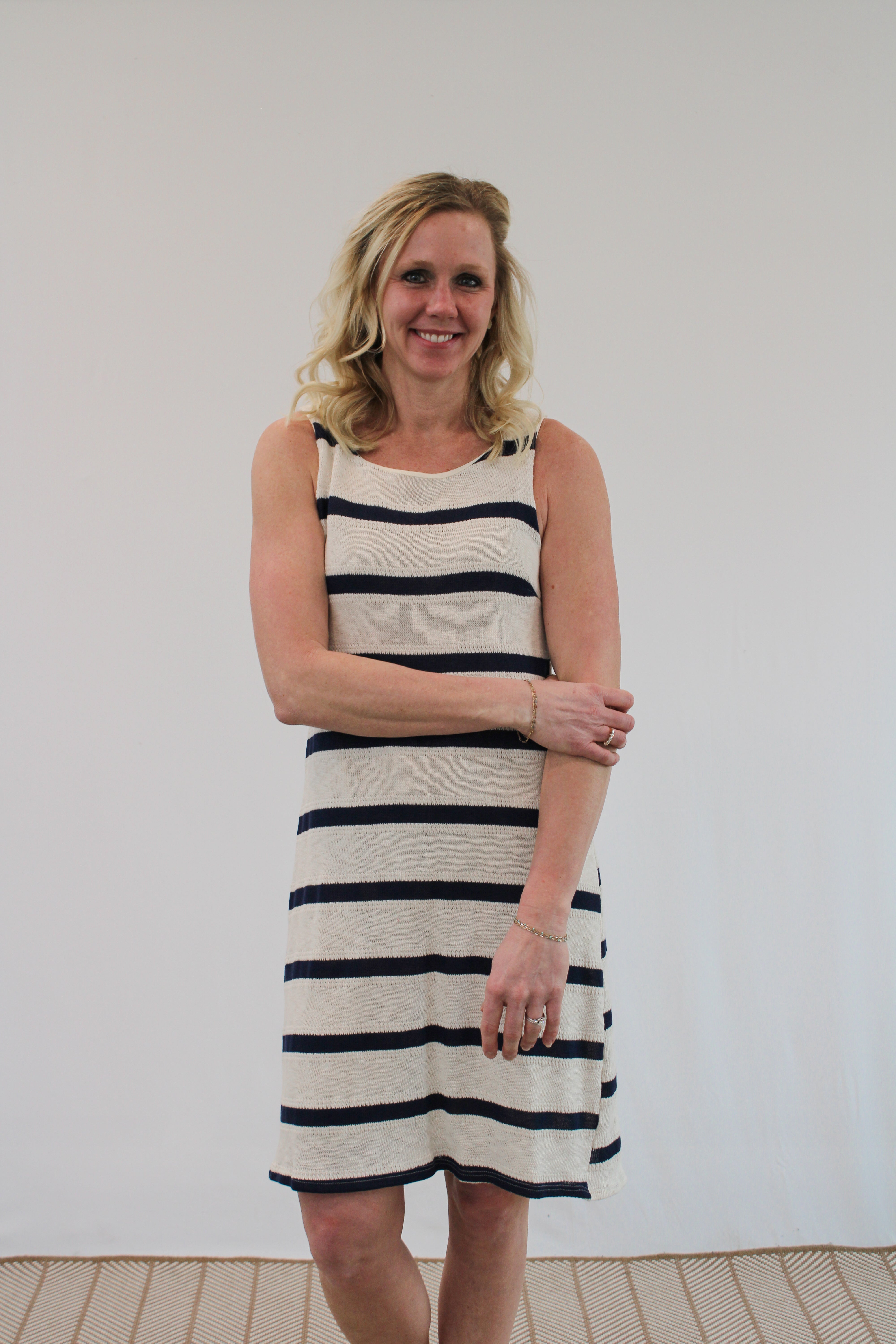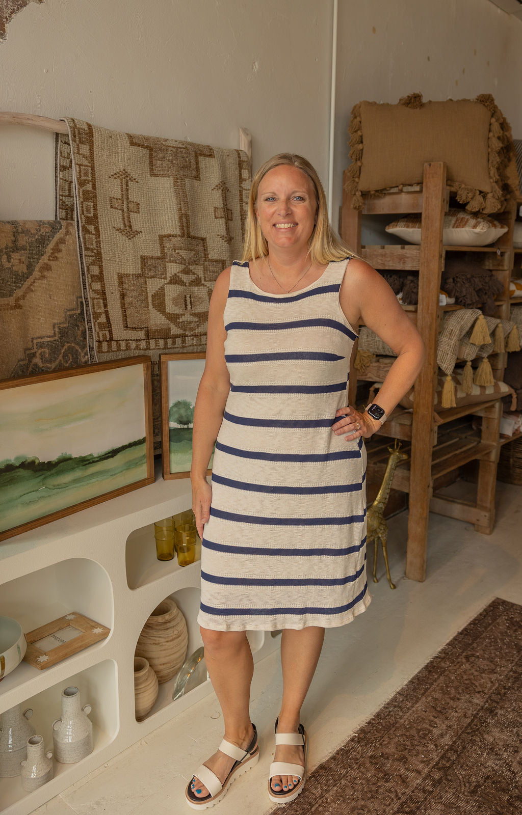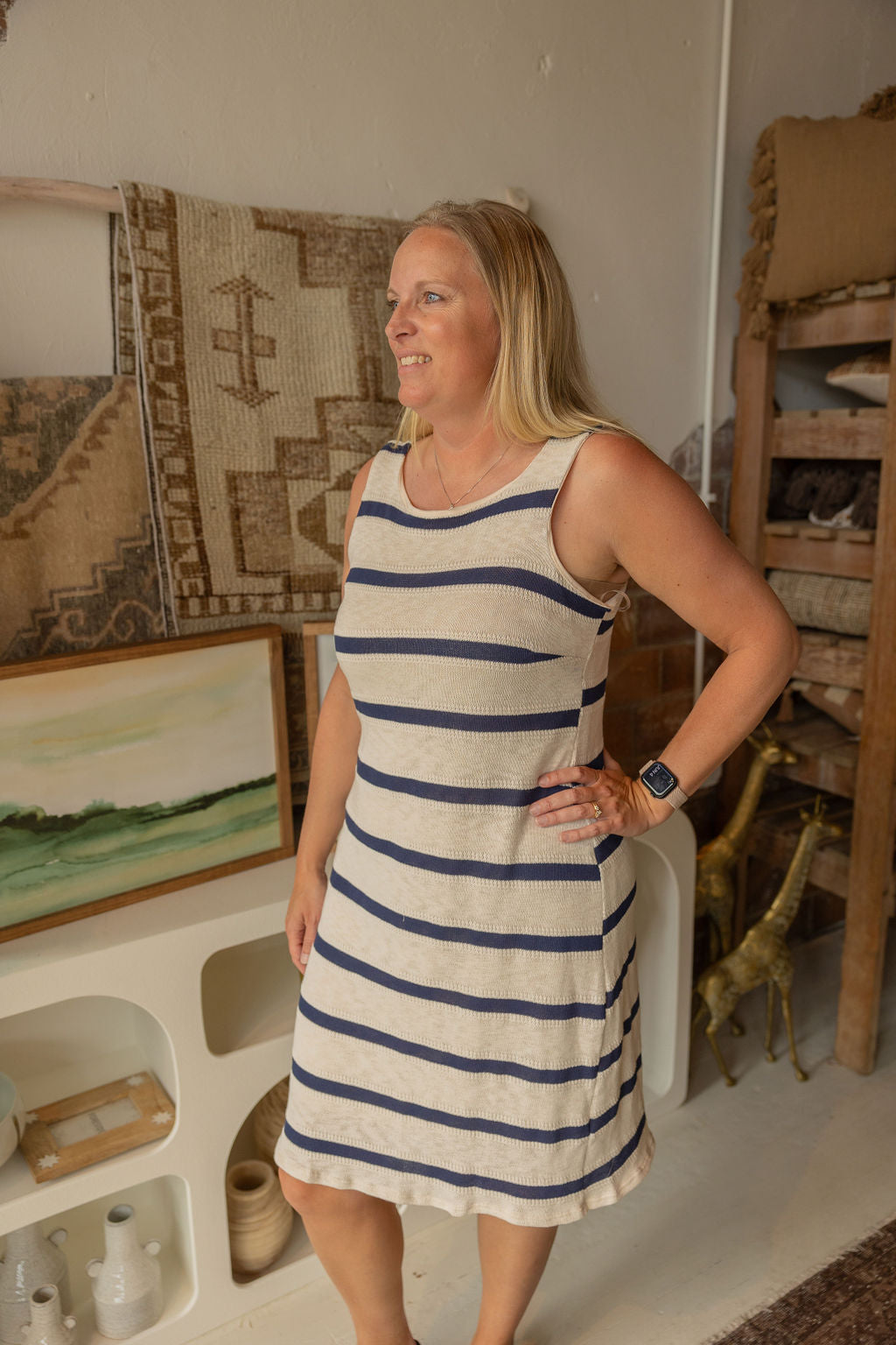 KENDRA KNITTED NAVY AND CREAM STRIPED DRESS
