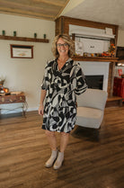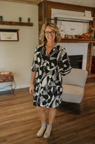 Elevate your style with the RAVENNA ABSTRACT DRESS. This long sleeve surplice dress features an eye-catching abstract pattern, perfect for adding a pop of color to your wardrobe. Its flattering silhouette and comfortable fit make it ideal for any occasion. Make a statement and stand out in this unique and playful dress.