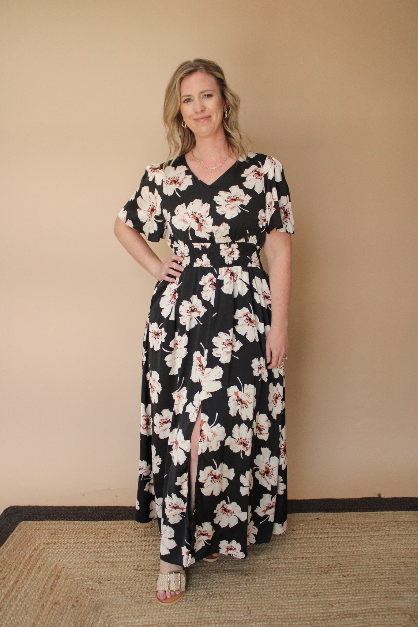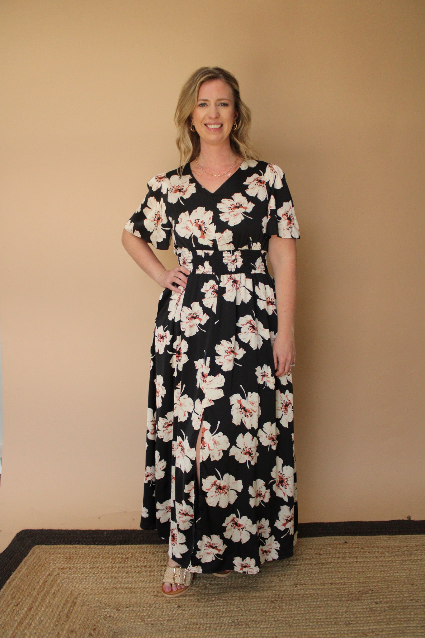 Embrace effortless elegance with this romantic floral midi dress, designed to celebrate your feminine style. The delicate floral print creates a dreamy aesthetic, while the smocked waist provides a flattering, adjustable fit that moves with you. A subtle slit detail adds just the right amount of allure and ease of movement. Perfect for garden parties, date nights, or any occasion calling for understated sophistication.