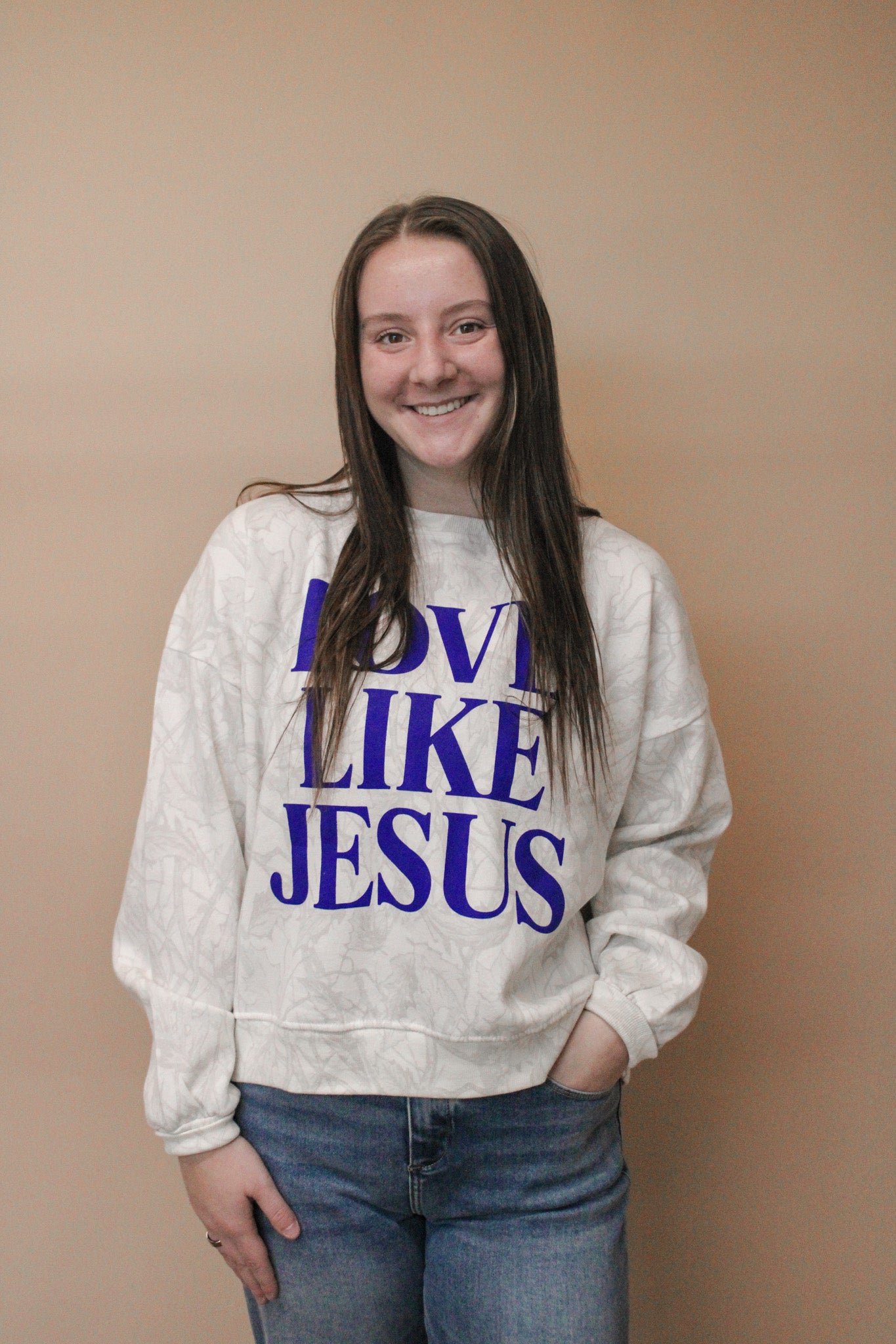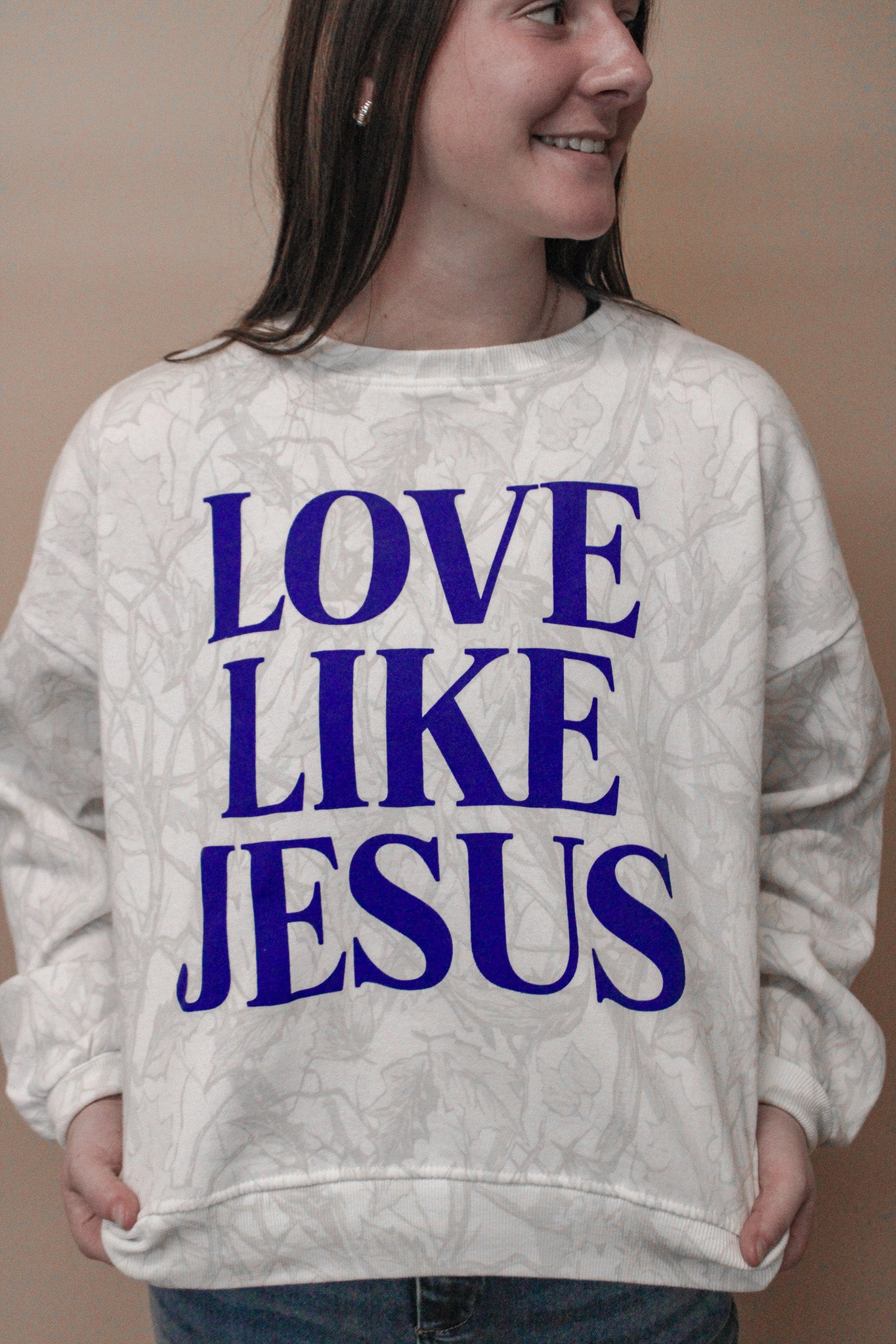 Spread the message in style with this oversized camo crewneck featuring a bold blue "Love Like Jesus" imprint. The light camouflage pattern gives it an edgy, modern vibe while the meaningful message keeps your values front and center. Perfect for layering or wearing solo, this relaxed fit flatters all body types and works for casual days when you want to make a statement. Comfort meets conviction in one fierce piece.
