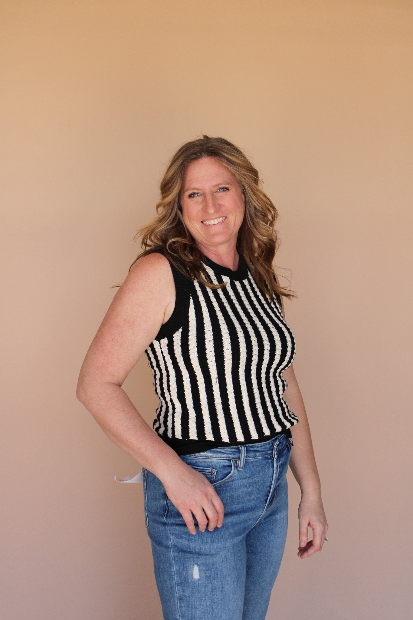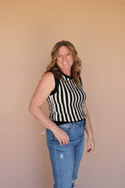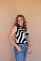 Effortless style meets comfort in this striped sleeveless essential. The classic round neckline and relaxed fit make it perfect for layering or wearing solo, while the black and cream stripes add just the right amount of visual interest. Crafted from soft knit fabric, this versatile top transitions seamlessly from casual days to dressed-up evenings. A wardrobe staple that works harder than it looks.