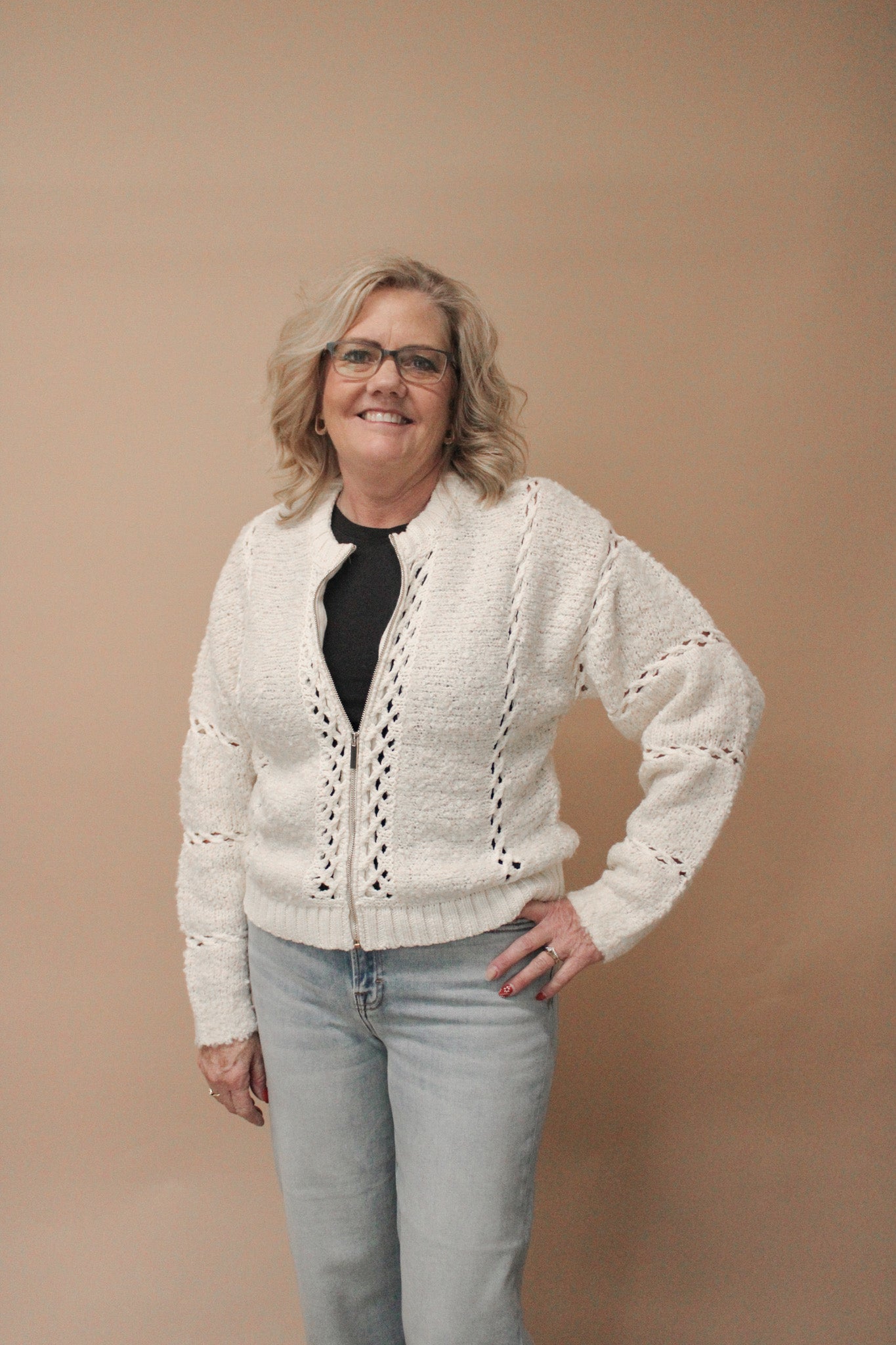 Soft texture meets delicate details in this zip-up sweater, crafted from plush, high-pile yarns and finished with intricate crochet insets and ribbed trim. It’s a feel-good layer that adds polish to any look.