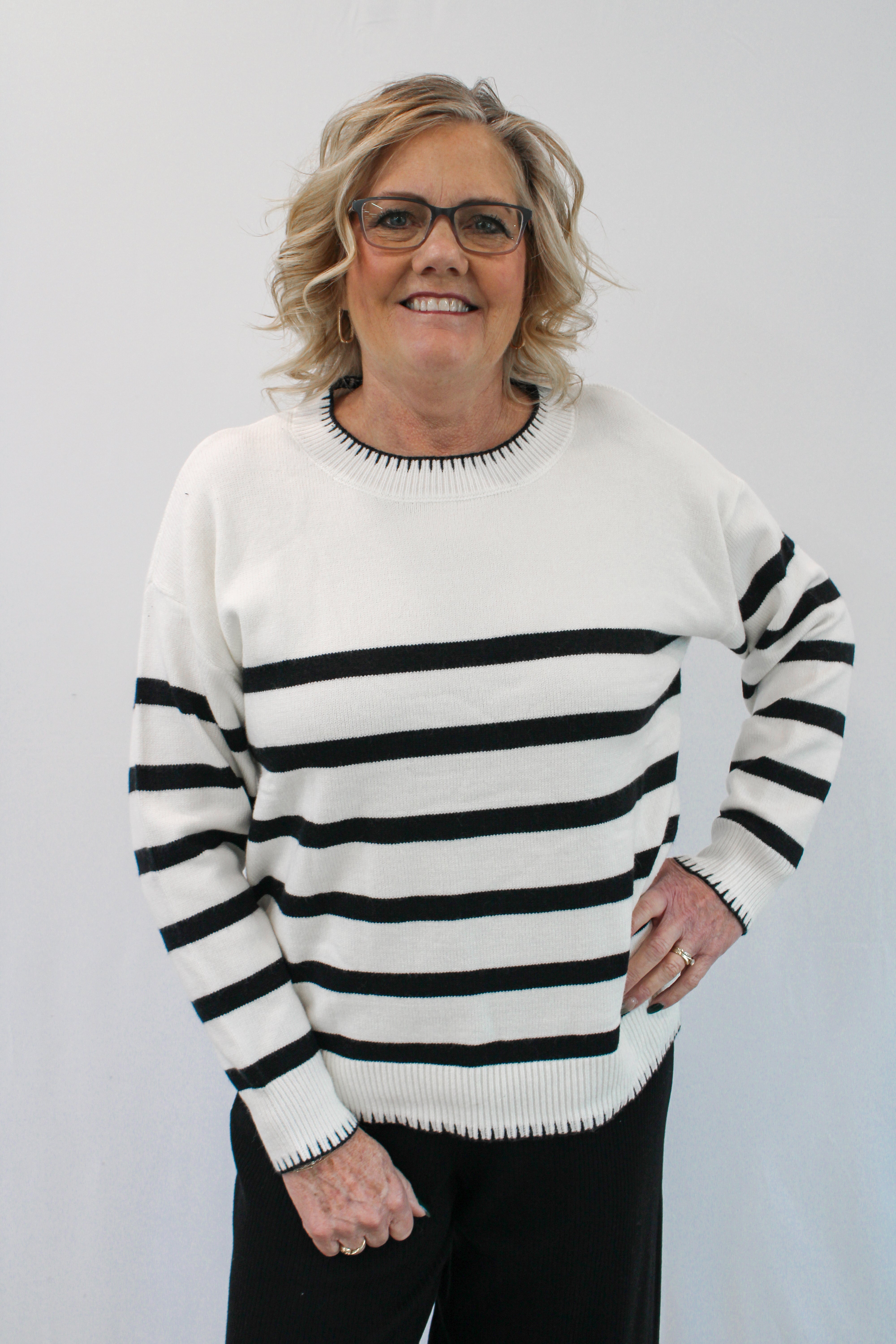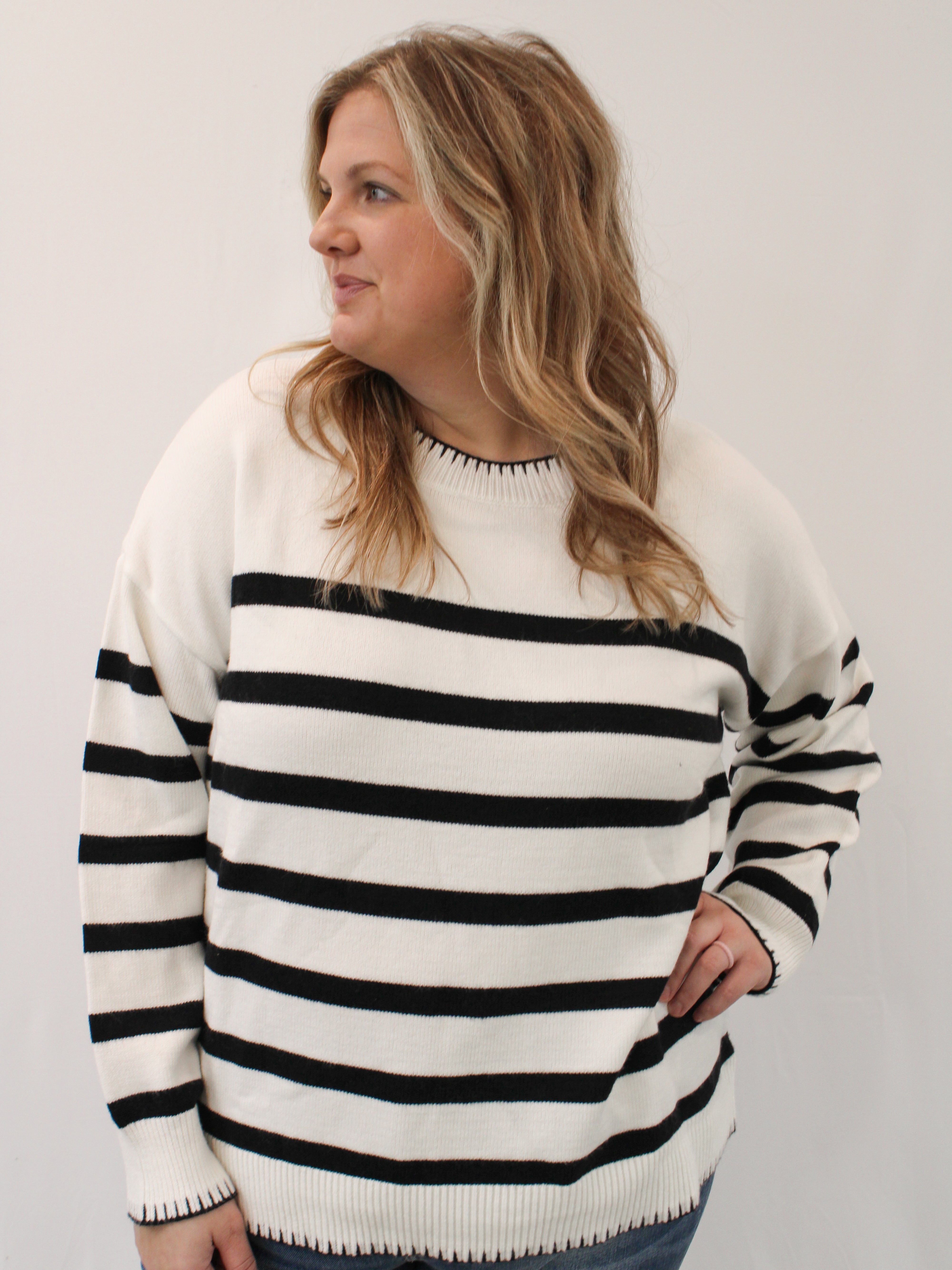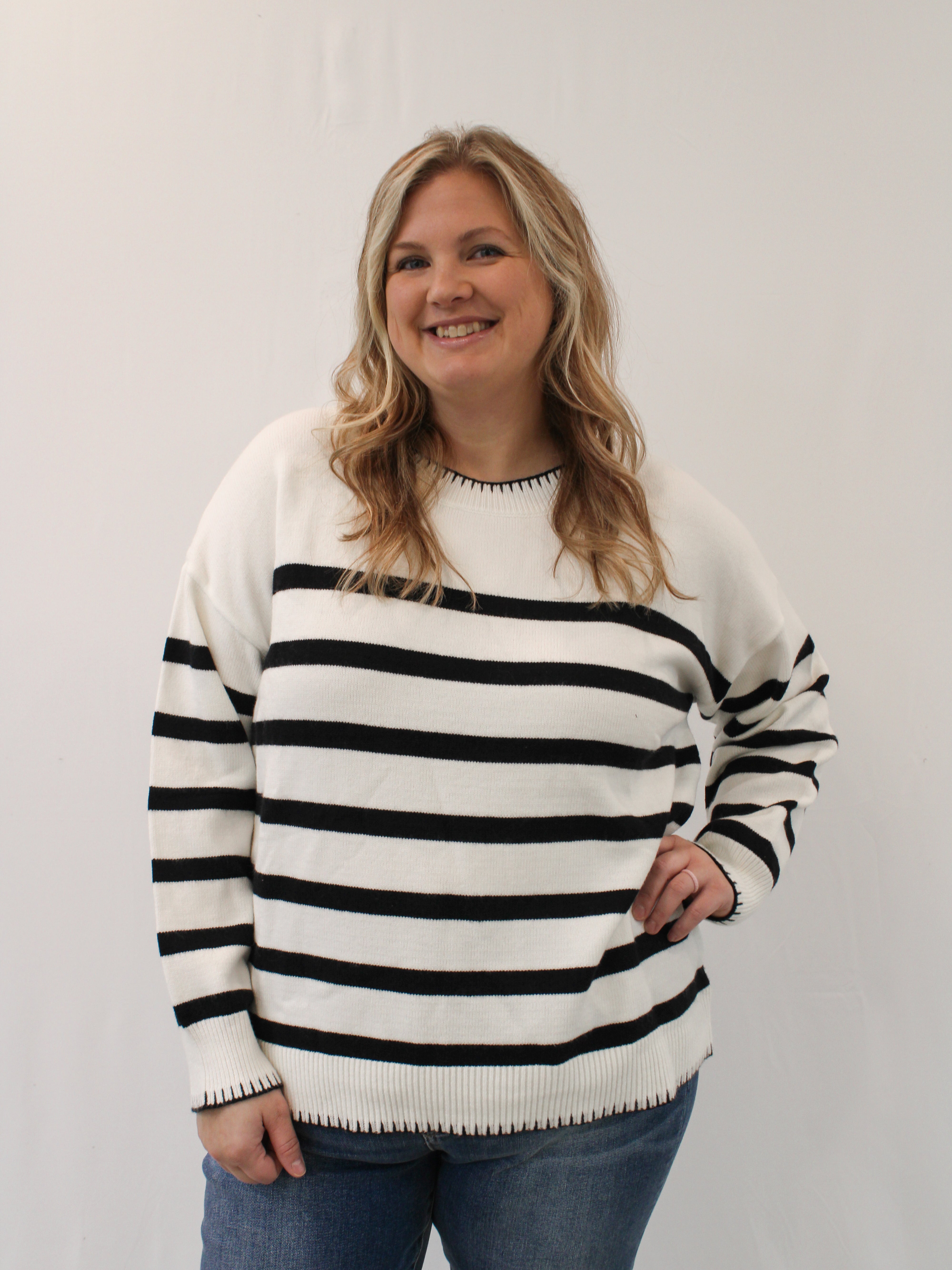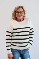 Introducing the DAEJA REG/CURVY STRIPED SWEATER - a cozy, lightweight knit perfect for any season. With its round neck, ribbed knit wrist and hem, and loose fit, this long sleeve top is both stylish and comfortable. Say yes to stripes with this must-have addition to your wardrobe!