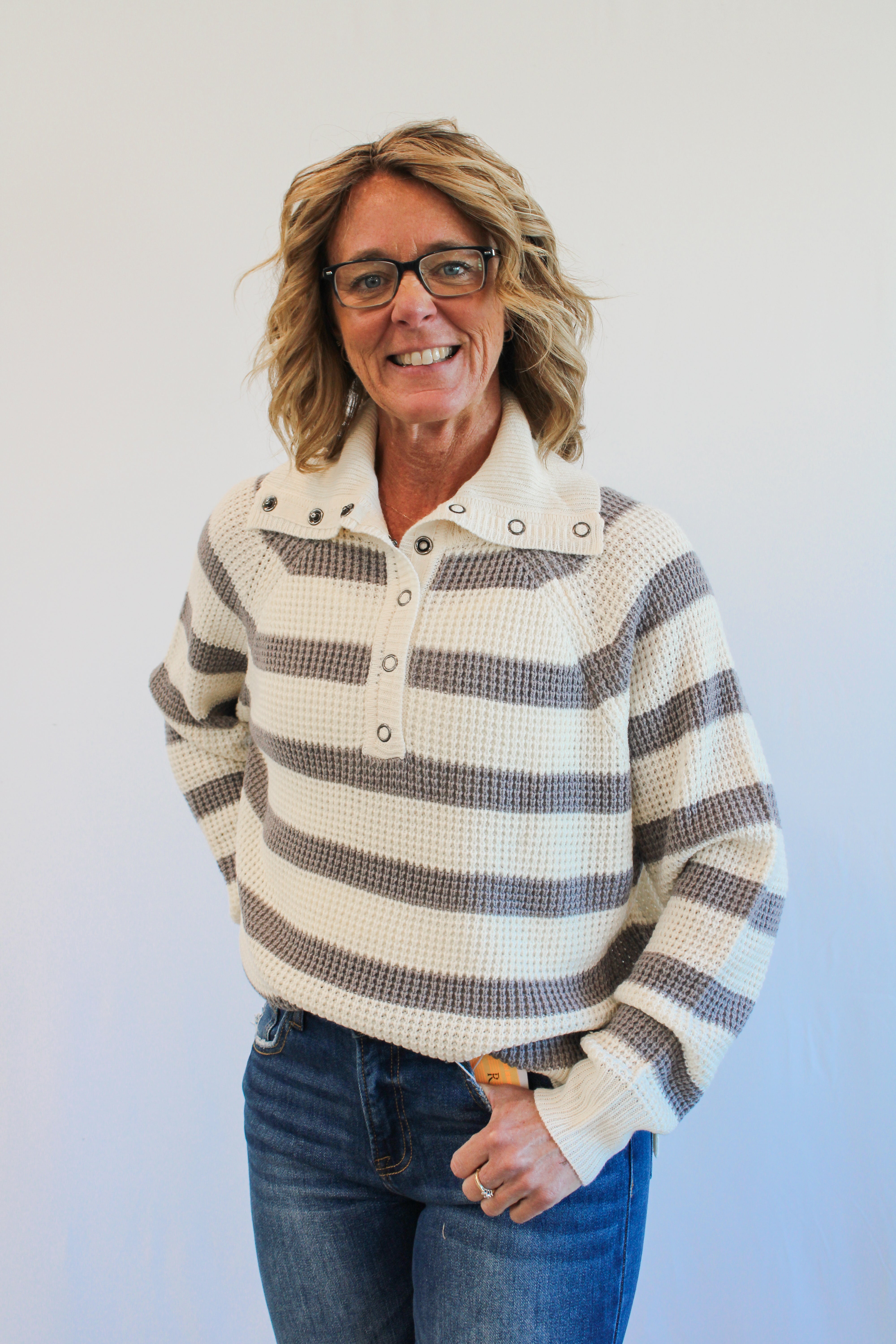Get cozy in this chunky knit striped sweater featuring a unique snap henley neckline and playful peter pan collar. Perfect for adding a touch of quirkiness to your wardrobe while staying warm and stylish.