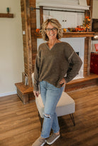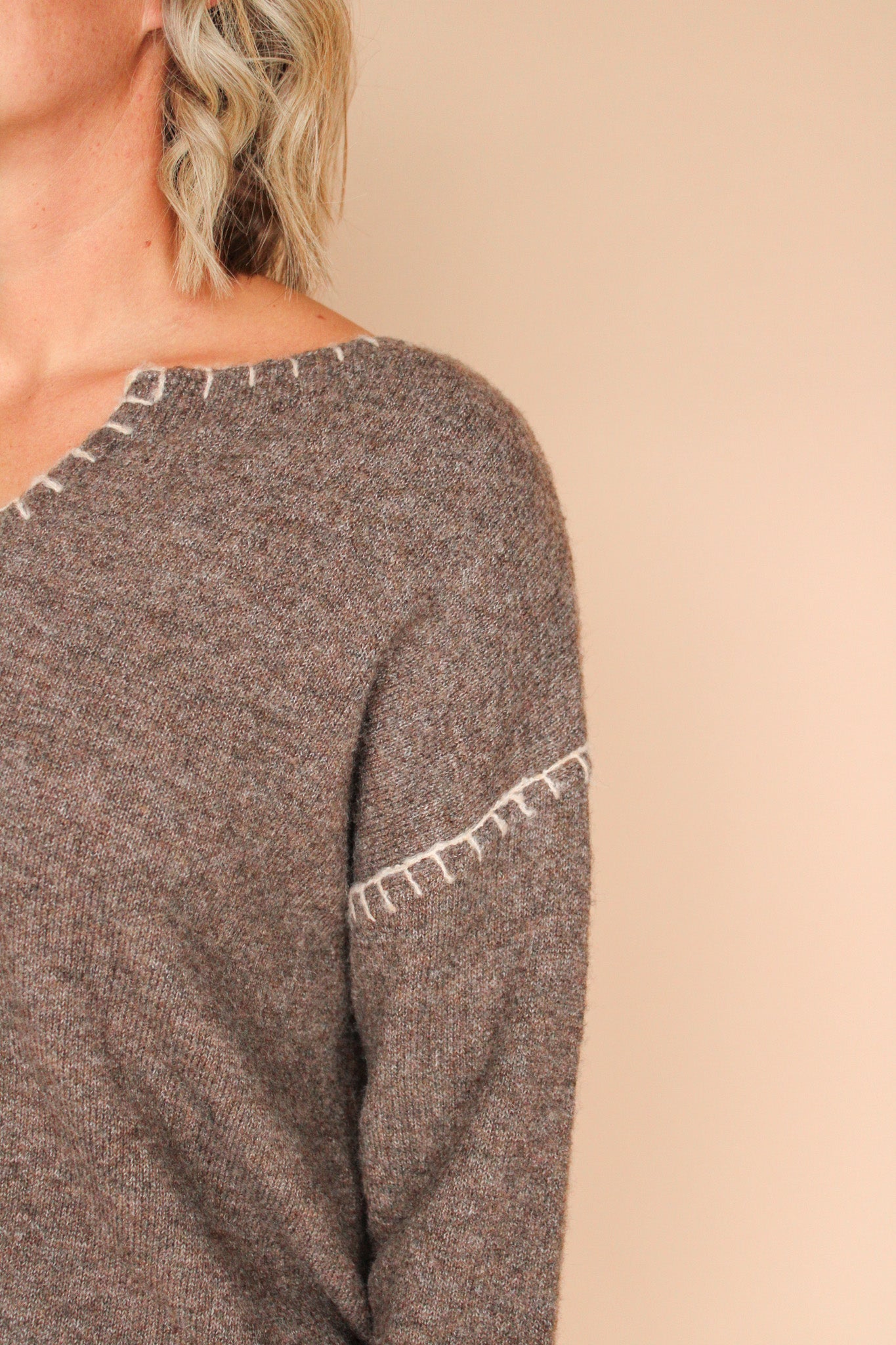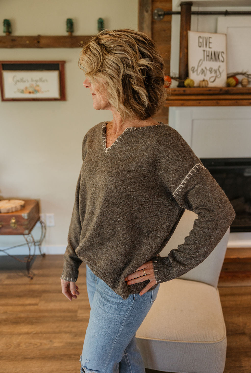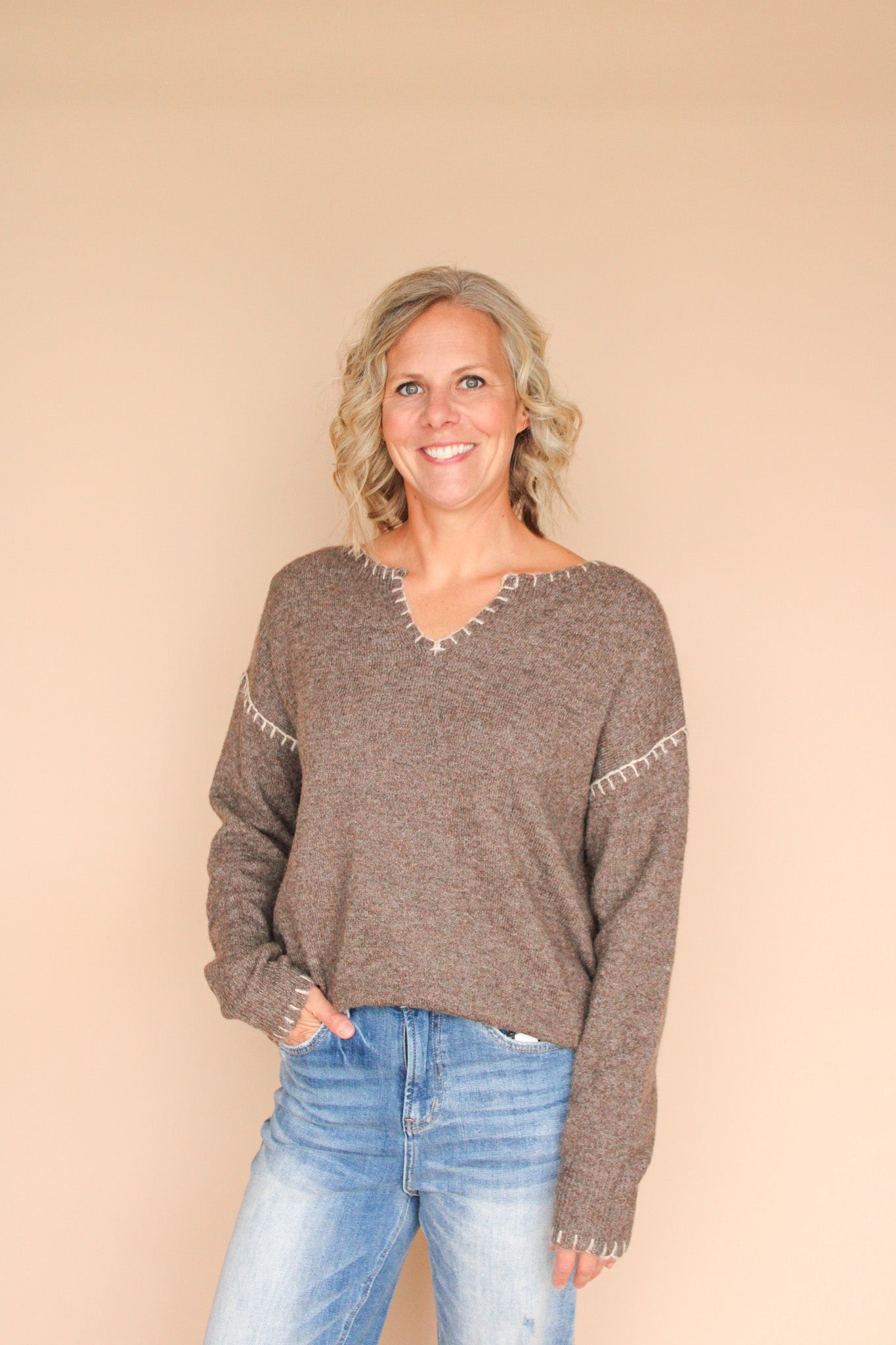 Stay cozy and chic in our Nanci Stitched V-Neck Sweater! With a unique blanket stitch detail and notched neck, this long sleeve pullover sweater will keep you warm and stylish. Perfect for any occasion, its versatility will have you reaching for it again and again.