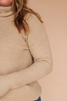 Stay warm and stylish with our STACIE TURTLENECK SWEATER! Made from soft taupe fabric with a cozy waffle texture, this sweater features a flattering turtleneck design. Perfect for any occasion, this sweater is a must-have for your wardrobe. Winter fashion never looked so good!