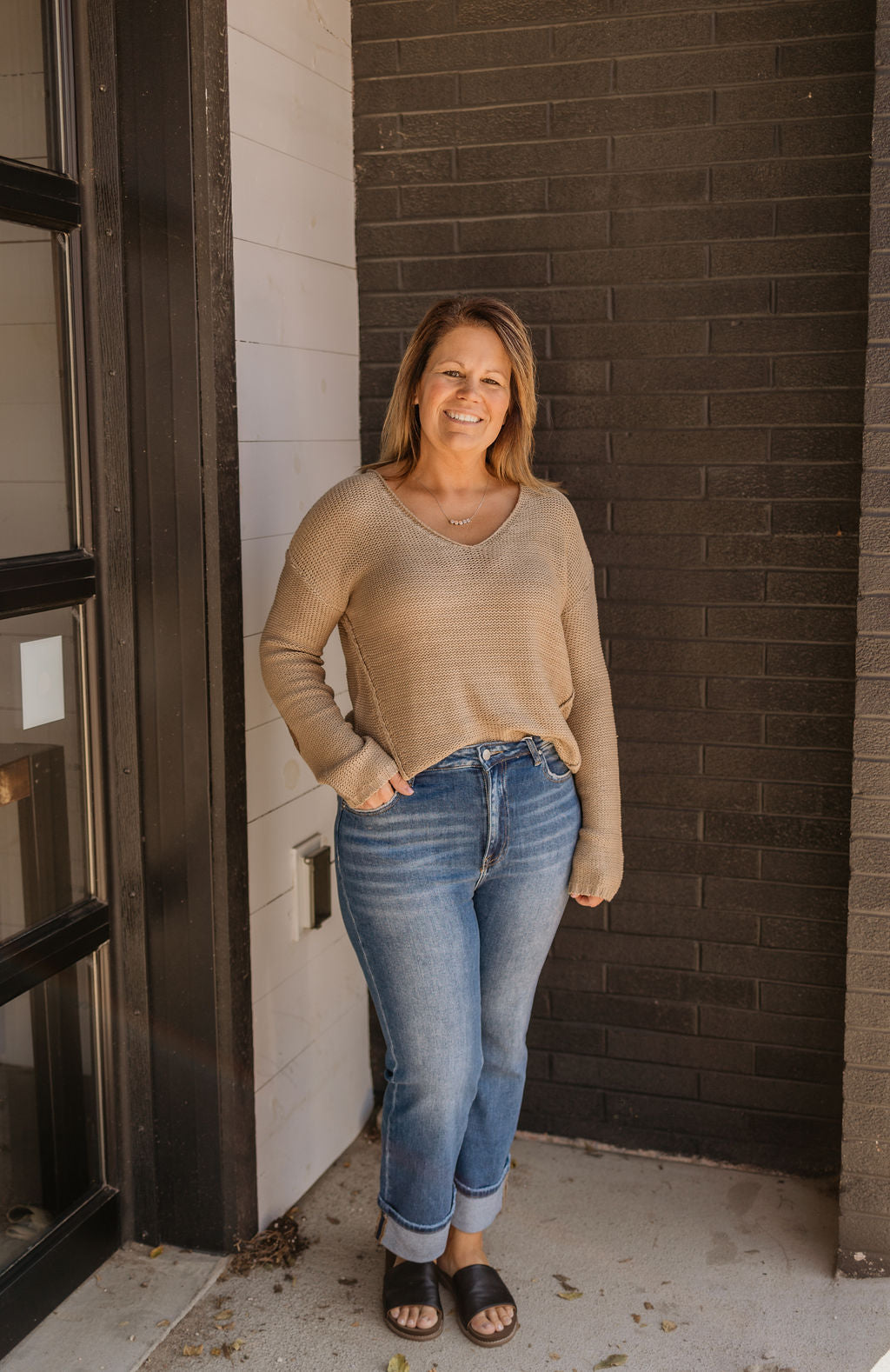 Featuring a flattering v-neck and faux suede elbow patches, this sweater is the perfect combination of comfort and fashion. Upgrade your wardrobe with this quirky and playful piece.