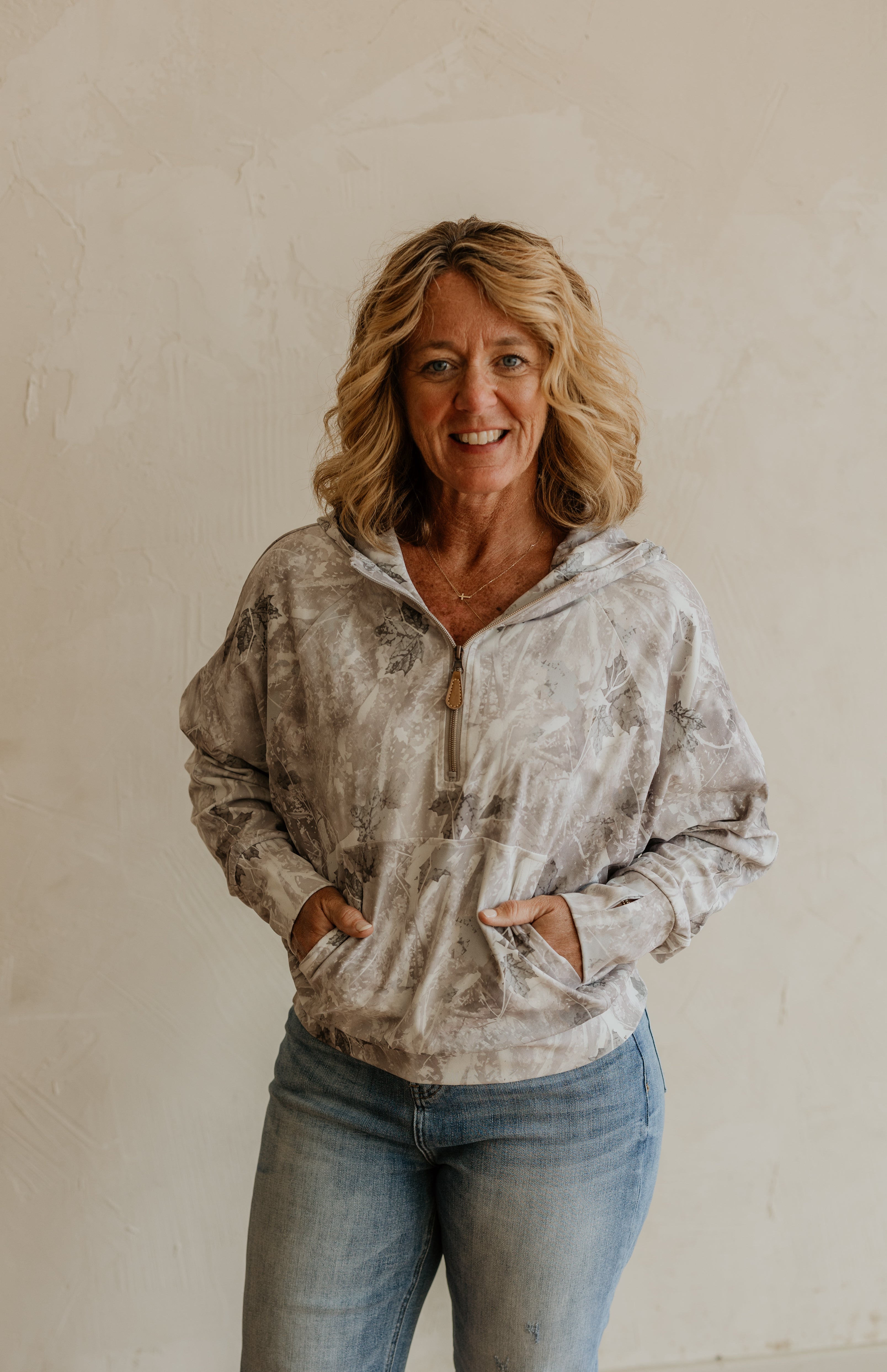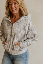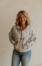 Stay cozy and cool in the CADENCE REG/CURVY CAMO HALF ZIP. This playful half-zip pullover features a trendy grey camo print and a convenient pouch pocket for your essentials or to keep your hands warm. Perfect for layering or wearing on its own, it adds a fun, casual vibe to your everyday look.