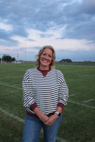 Cozy up in the GABI Cloudy Knit Stripe Sweatshirt, where comfy meets cute. Featuring a round neck and playful contrasting stripes, this knit brings a fun twist to your casual look. Perfect for layering or lounging, it adds a splash of charm to your everyday style.