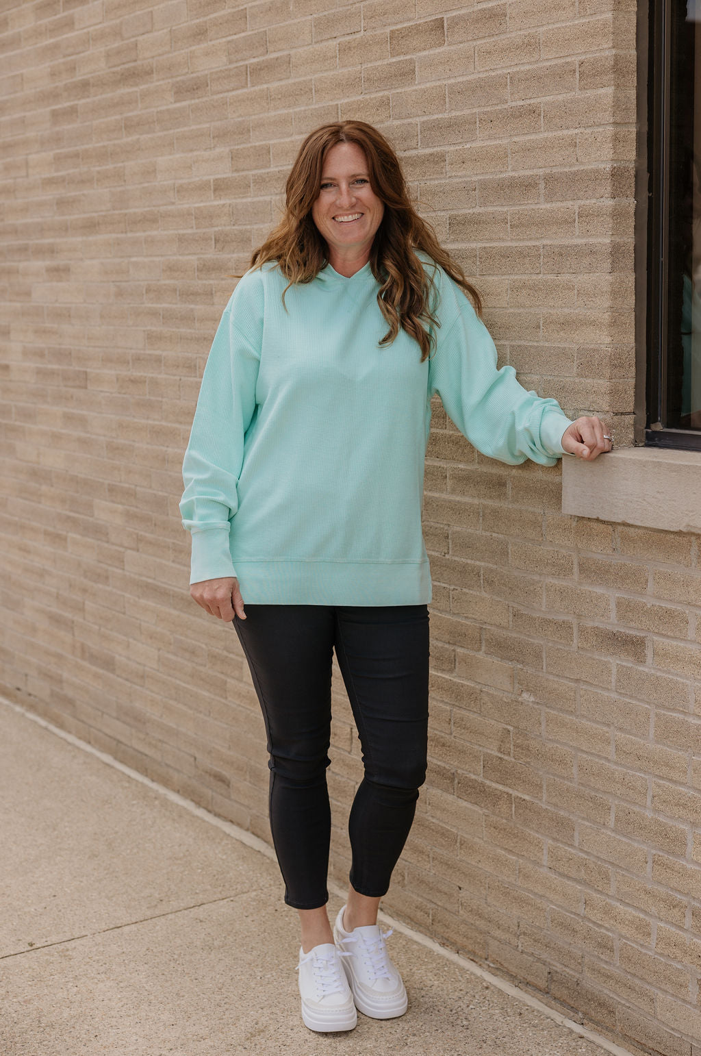 Luxury Corded Crew Sweatshirt is made of corded fabric for a soft, yet structured feel. Its vintage wash delivers rich, warm colors. Oversized fit features a ribbed neckline, cuffs, and hemline. Custom dyed and snow washed for softness and vintage look