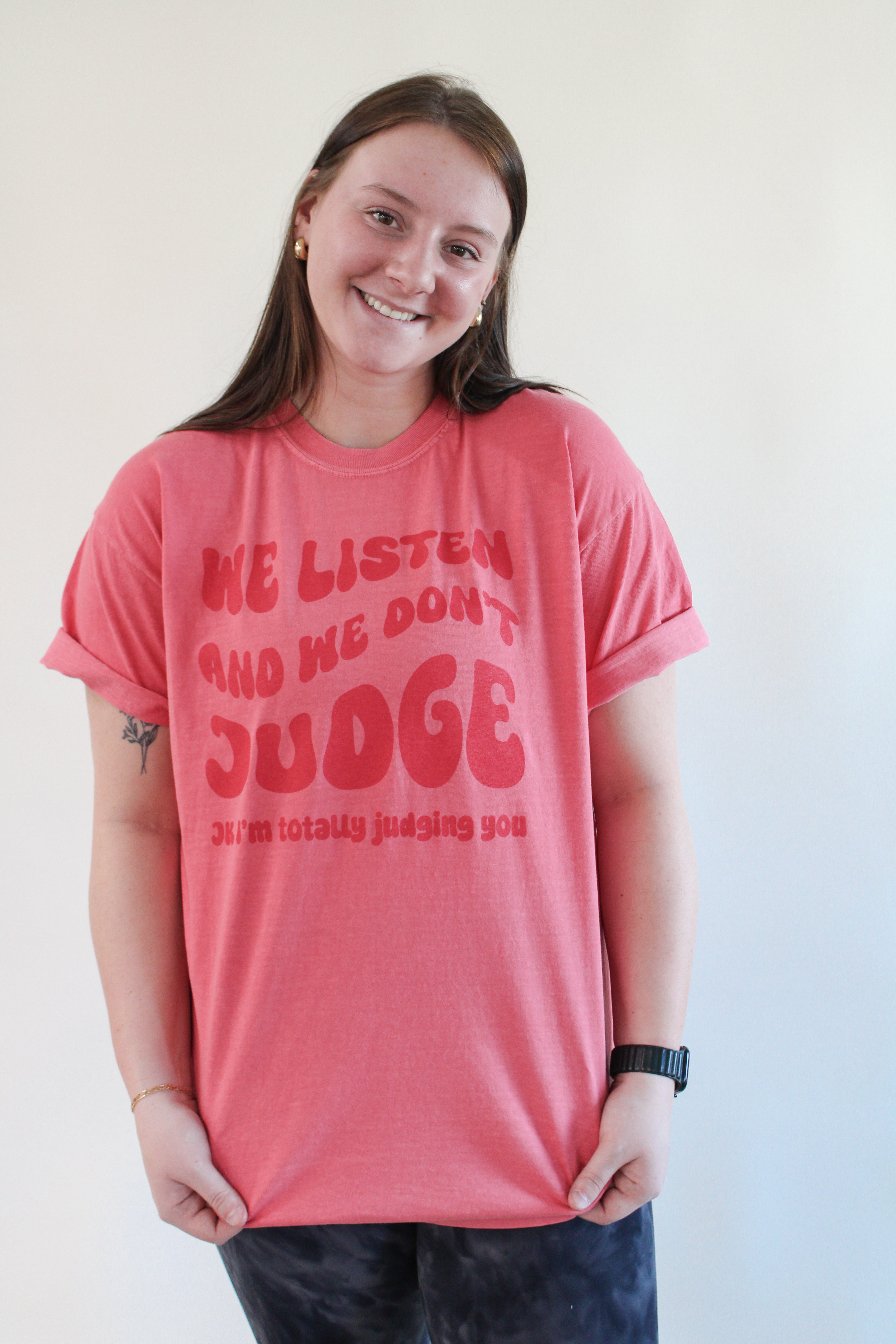 WE LISTEN AND WE DON'T JUDGE GRAPHIC TEE