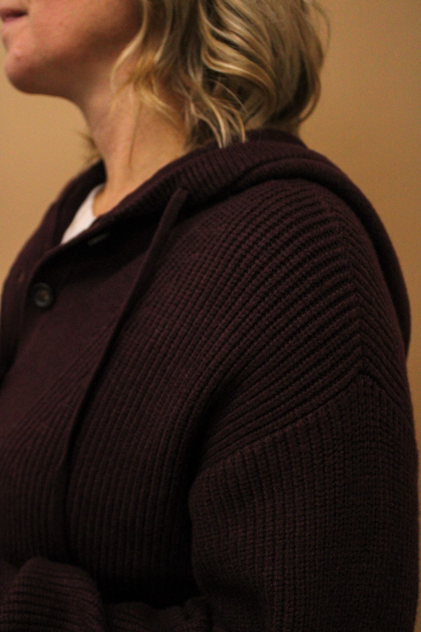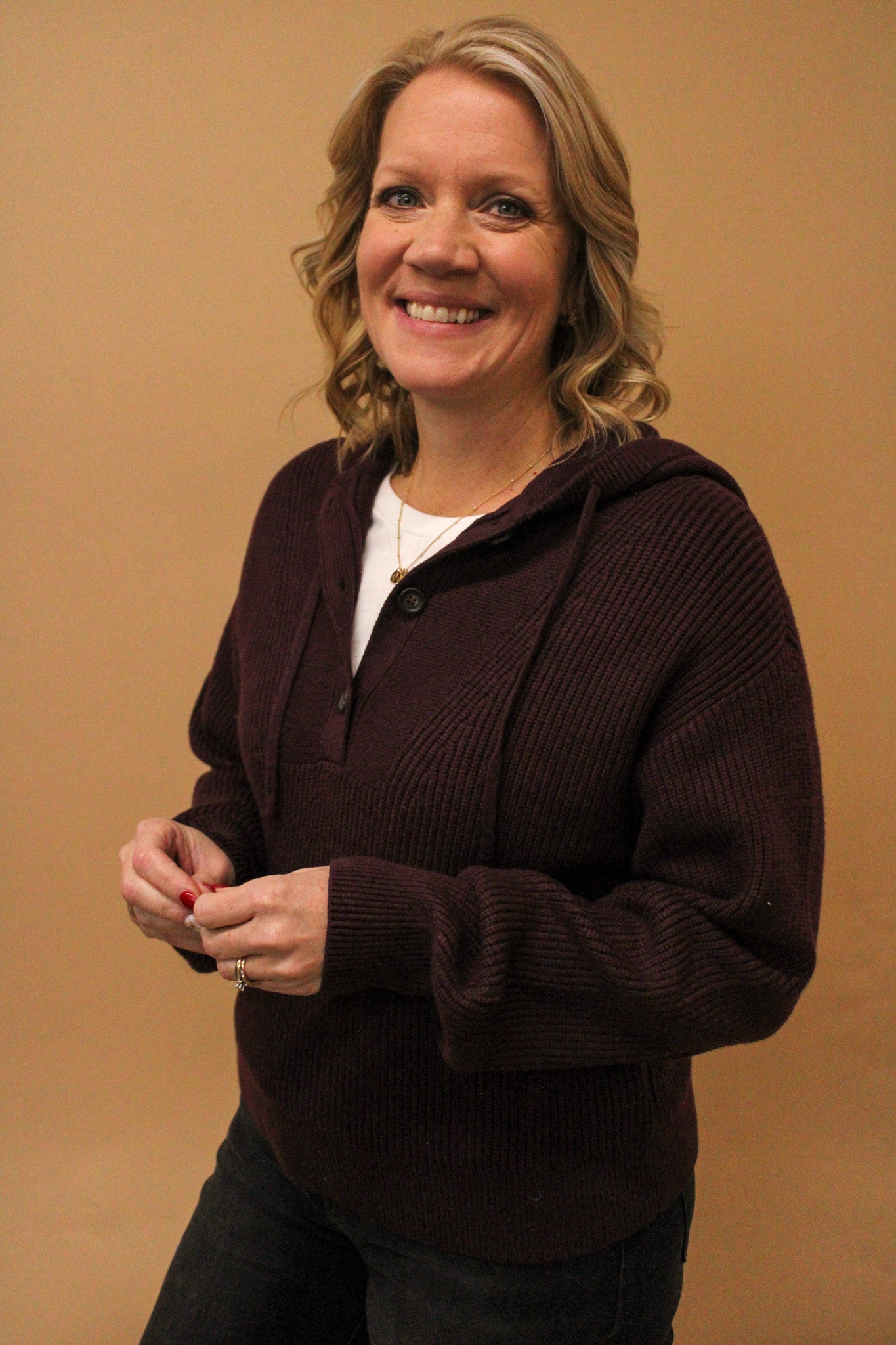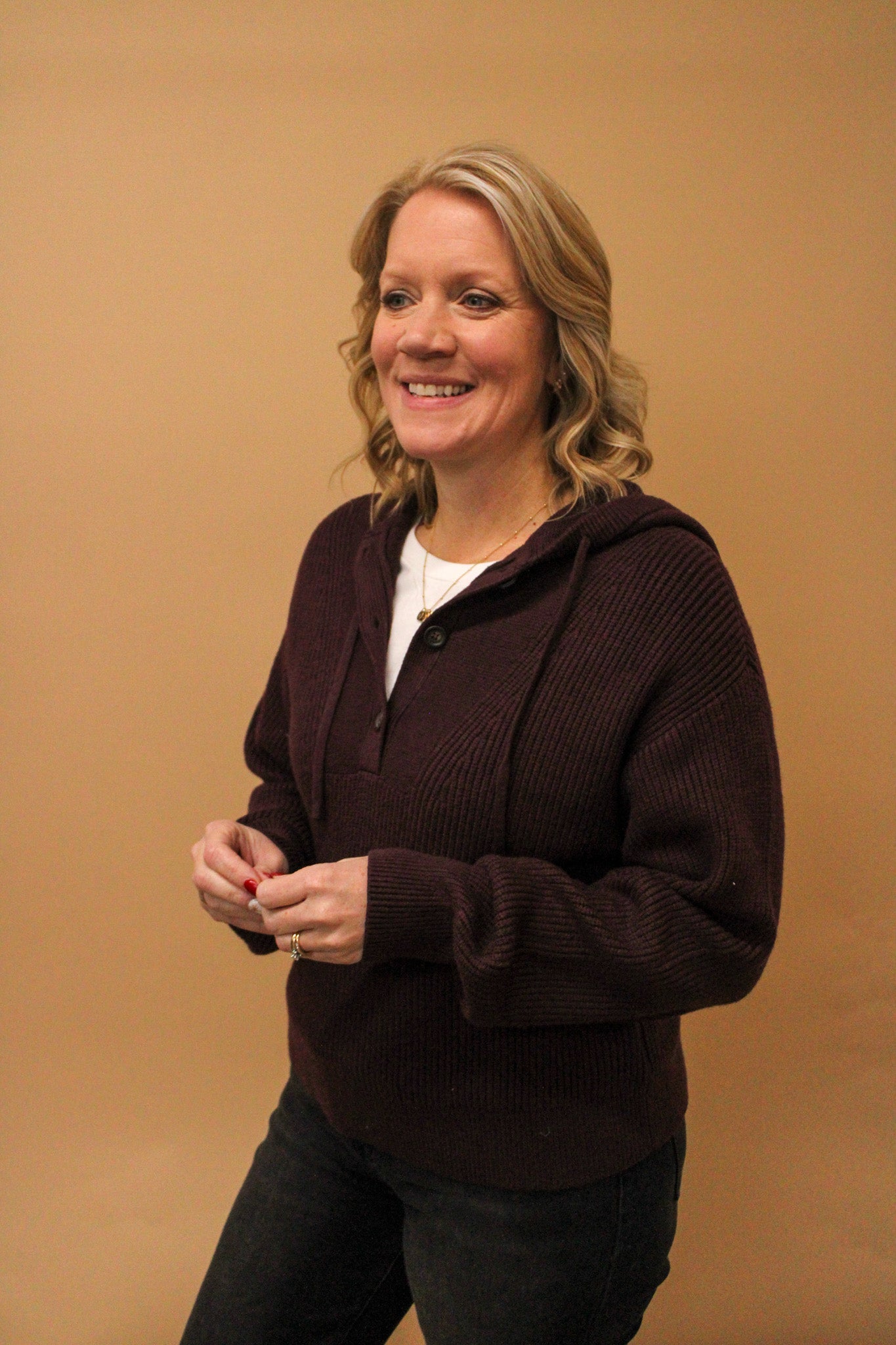 The definition of cozy, this ribbed knit pullover is featured in a slouchy drop shoulder with a half button closure and attached hood.